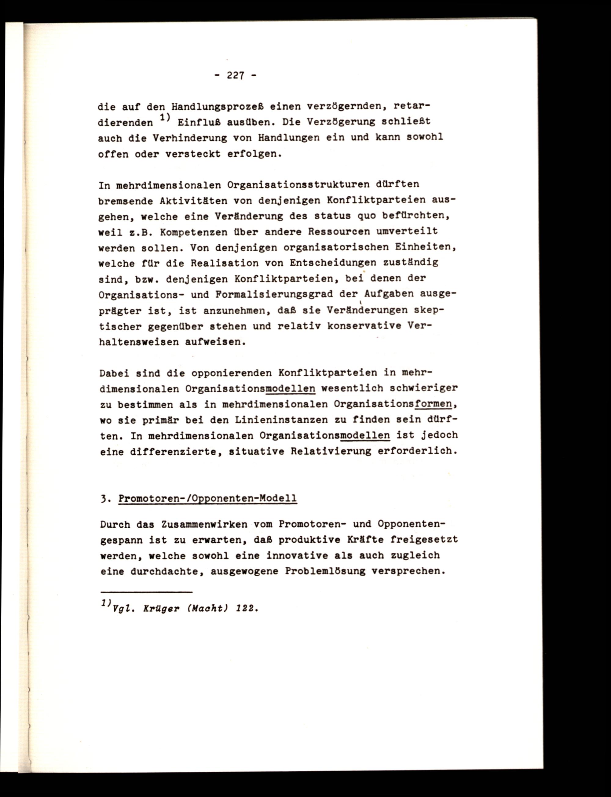 In mehrdimensionalen Organisationsstrukturen dürften bremsende Aktivitäten von denjenigen Konfliktparteien ausgehen, welche eine Veränderung des status quo befürchten, weil z.B. Kompetenzen über andere Ressourcen umverteilt werden sollen. Von denjenigen organisatorischen Einheiten, welche für die Realisation von Entscheidungen zuständig sind, bzw. denjenigen Konfliktparteien, bei denen der Organisations- und Formalisierungsgrad der Aufgaben ausgeprägter ist, ist anzunehmen, daß sie Veränderungen skeptischer gegenüber stehen und relativ konservative Verhaltensweisen aufweisen.