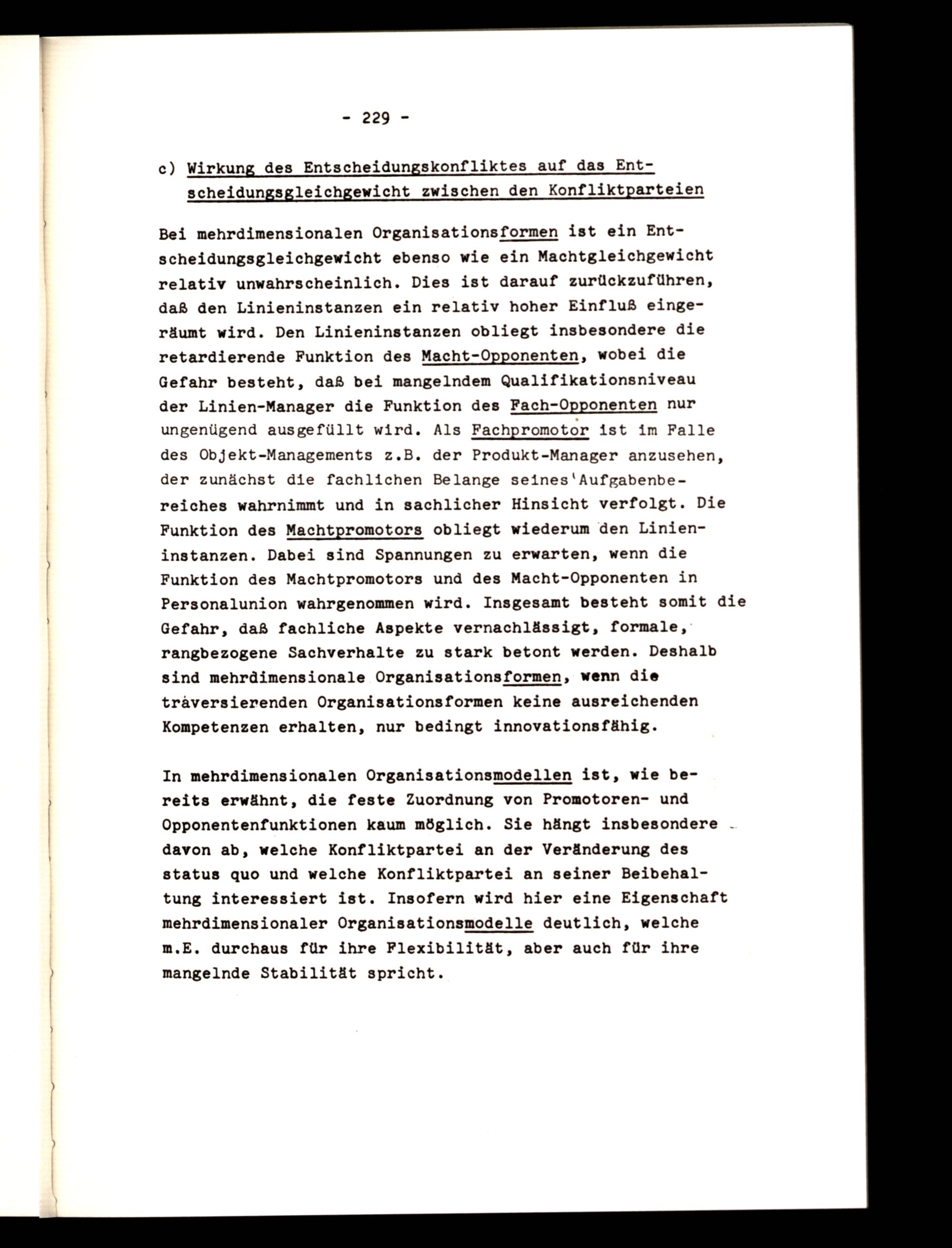 Bei mehrdimensionalen Organisationsformen ist ein Entscheidungsgleichgewicht ebenso wie ein Machtgleichgewicht relativ unwahrscheinlich. Dies ist darauf zurückzuführen, daß den Linieninstanzen ein relativ hoher Einfluß eingeräumt wird. Den Linieninstanzen obliegt insbesondere die retardierende Funktion des Macht-Opponenten, wobei die Gefahr besteht, daß bei mangelndem Qualifikationsniveau der Linien-Manager die Funktion des Fach-Opponenten nur ungenügend ausgefüllt wird. Als Fachpromotor ist im Falle des Objekt-Managements z.B. der Produkt-Manager anzusehen, der zunächst die fachlichen Belange seines‘Aufgabenbereiches wahrnimmt und in sachlicher Hinsicht verfolgt. Die Funktion des Machtpromotors obliegt wiederum den Linieninstanzen. Dabei sind Spannungen zu erwarten, wenn die Funktion des Machtpromotors und des Macht-Opponenten in