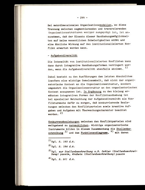 Bei mehrdimensionalen Organisationsmodellen, wo diese Trennung zwischen segmentierenden und traversierenden Organisationsstrukturen weniger ausgeprägt ist, ist anzunehmen, daß der Einsatz dieser Handhabungsmöglichkeiten auf keine wesentlichen Schwierigkeiten stößt und eine ähnliche Wirkung auf den institutionalisierten Konflikt erwartet werden kann.