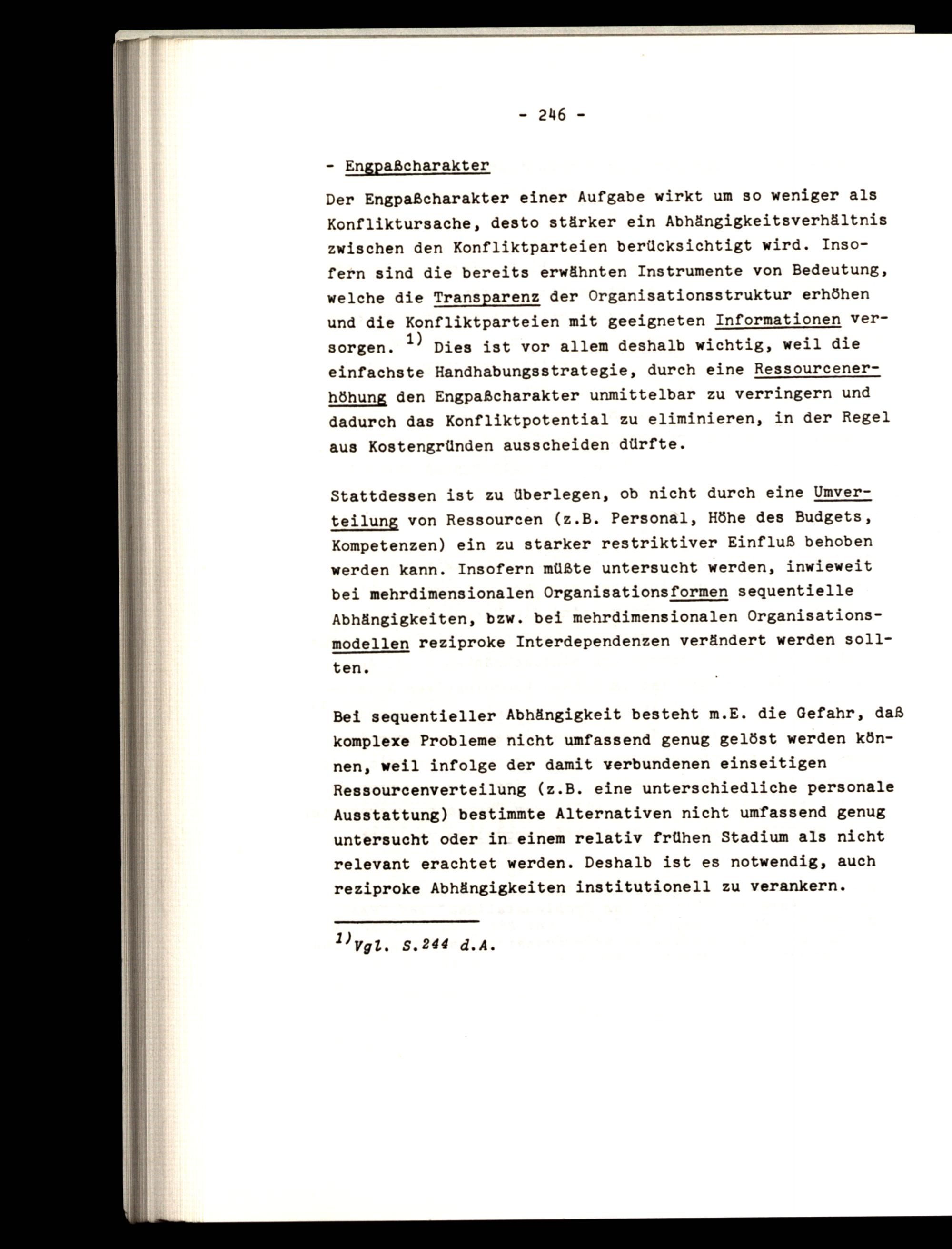 Bei sequentieller Abhängigkeit besteht m.E. die Gefahr, daß komplexe Probleme nicht umfassend genug gelöst werden können, weil infolge der damit verbundenen einseitigen Ressourcenverteilung(z.B. eine unterschiedliche personale Ausstattung) bestimmte Alternativen nicht umfassend genug untersucht oder in einem relativ frühen Stadium als nicht relevant erachtet werden. Deshalb ist es notwendig, auch reziproke Abhängigkeiten institutionell zu verankern.