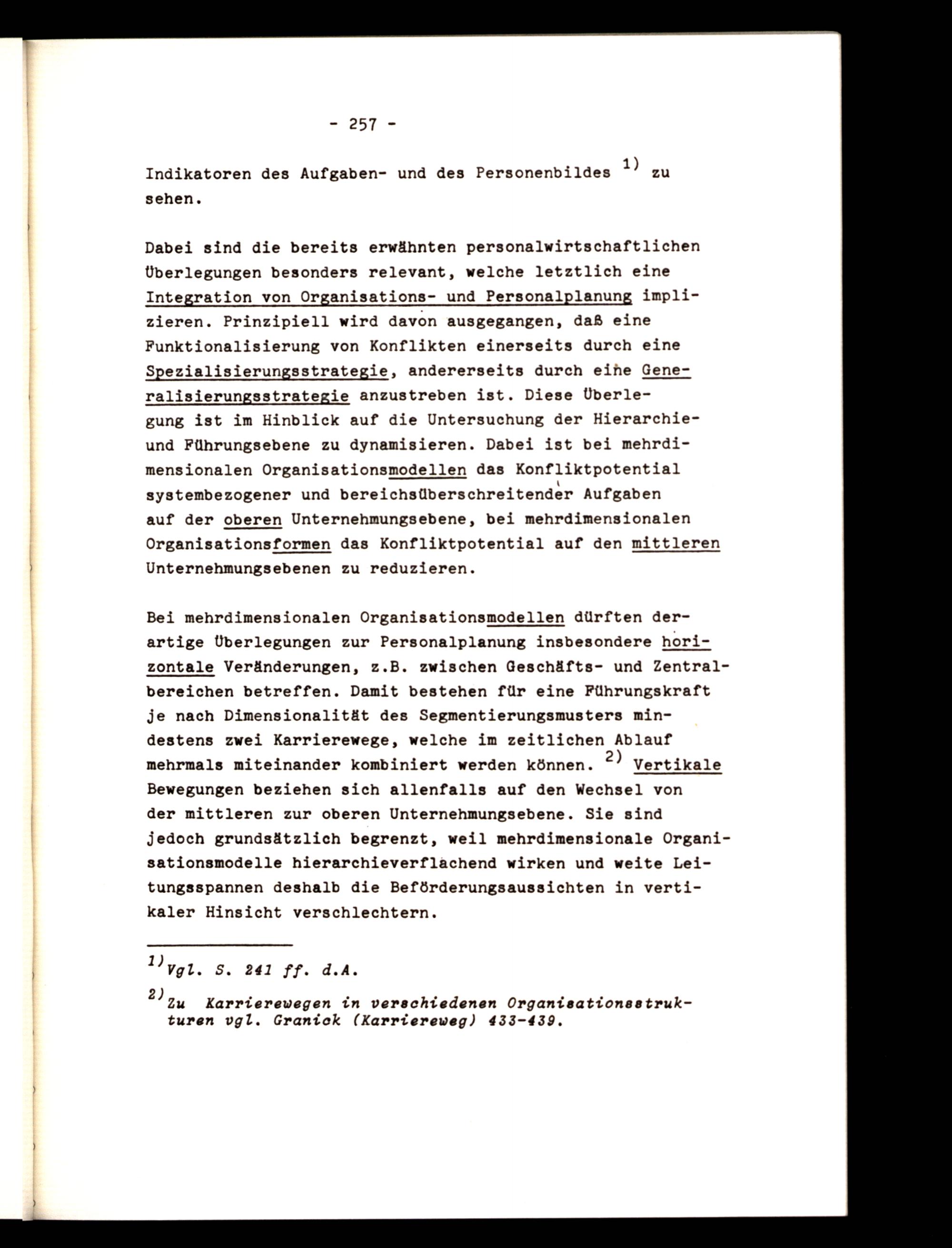 Bei mehrdimensionalen Organisationsmodellen dürften derartige Überlegungen zur Personalplanung insbesondere horizontale Veränderungen, z.B. zwischen Geschäfts- und Zentralbereichen betreffen. Damit bestehen für eine Führungskraft je nach Dimensionalität des Segmentierungsmusters mindestens zwei Karrierewege, welche im zeitlichen Ablauf mehrmals miteinander kombiniert werden können. 2) Vertikale Bewegungen beziehen sich allenfalls auf den Wechsel von