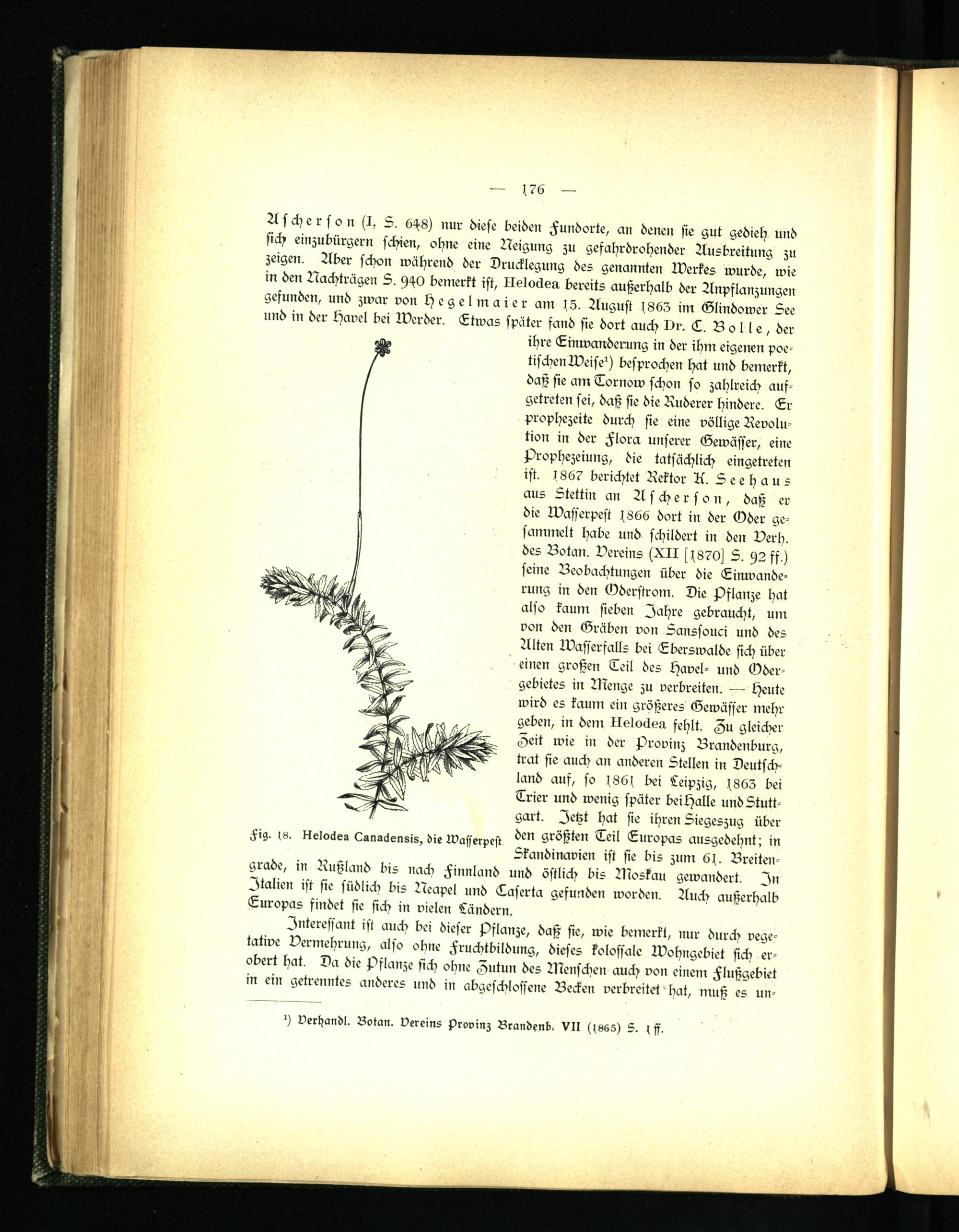 Ascherson (I, 5. 6-18) nur diese beiden Hundorte, an denen sie gut gedieh und sich einzubürgern schien, ohne eine Neigung zu gefahrdrohender Ausbreitung zu zeigen. Aber schon während der Drucklegung des genannten Werkes wurde, wie in den Nachträgen 5. 910 bemerkt ist, Ilelockea bereits außerhalb der Anpflanzungen gefunden, und zwar von Hegel maier am 15. August 1863 im Glindower See und in der Havel bei Werder. Etwas später fand sie dort auch vr. L. Bolle, der