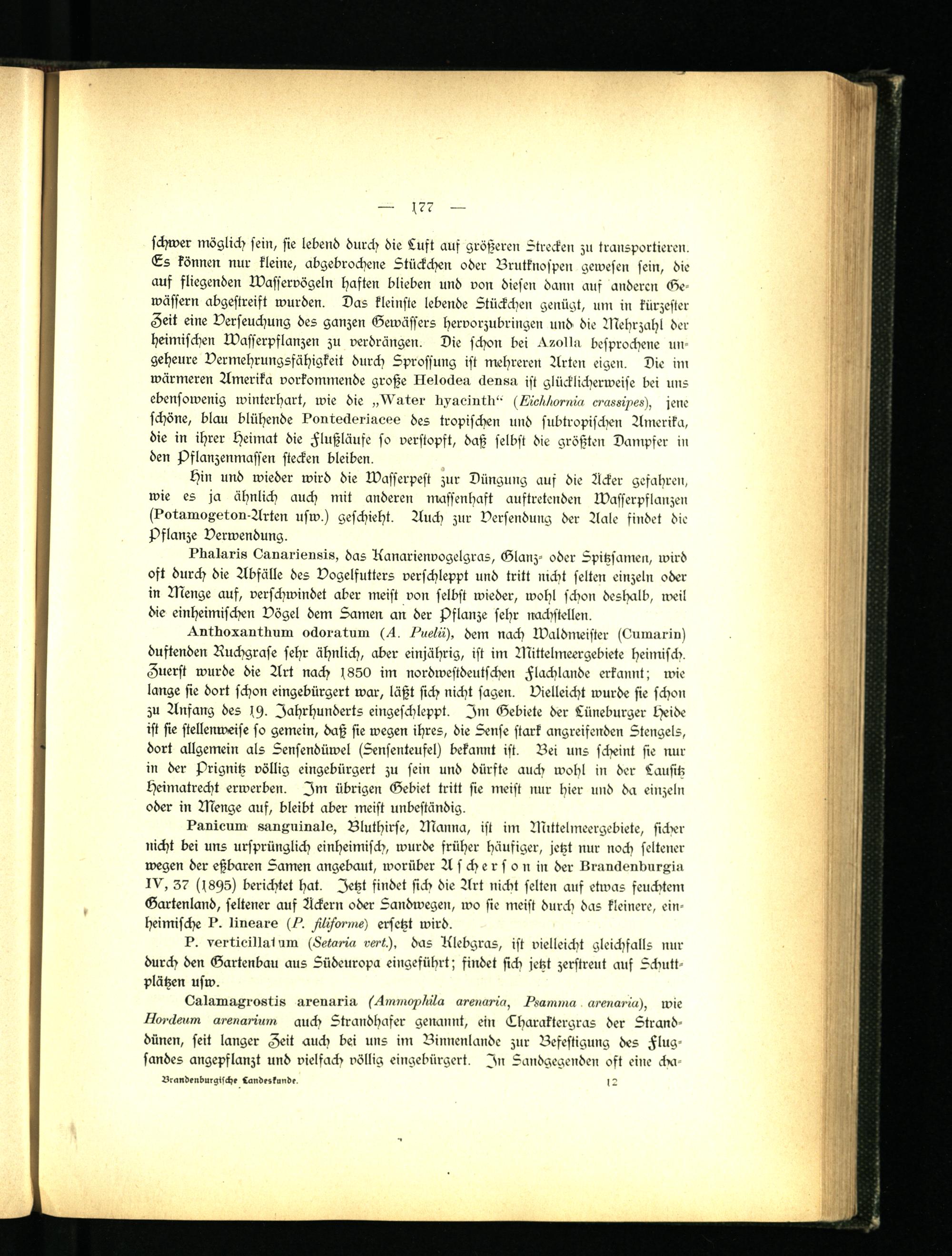 Vntboxaiittmm oäoratum (A. VuM), dem nach Waldmeister (Oumariu) duftenden Ruchgrase sehr ähnlich, aber einjährig, ist im Wittelmeergebiete heimisch. Zuerst wurde die Art nach f850 im nordwestdeutschen Flachlande erkannt; wie lange sie dort schon eingebürgert war, läßt sich nicht sagen. Vielleicht wurde sie schon zu Anfang des jst. Jahrhunderts eingeschleppt. Zm Gebiete der Lüneburger Heide ist sie stellenweise so gemein, daß sie wegen ihres, die Sense stark angreifenden Stengels, dort allgemein als Sensendüwel (Sensenteufel) bekannt ist. Bei uns scheint sie nur in der Prignitz völlig eingebürgert zu sein und dürfte auch wohl in der Lausitz Heimatrecht erwerben. Zm übrigen Gebiet tritt sie meist mir hier und da einzeln oder in Wenge auf, bleibt aber meist unbeständig.