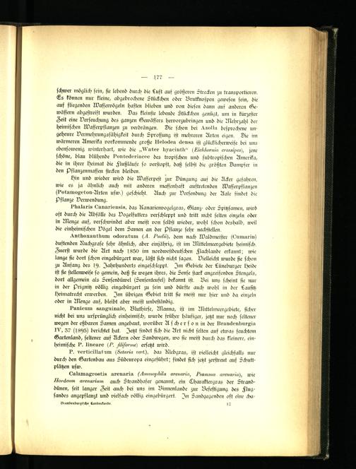 Vdalaris Oanariensis, das Ranarienvogelgras, Glanz- oder Spitzsamen, wird oft durch die Abfälle des Vogelfutters verschleppt und tritt incht selten einzeln oder in Wenge auf, verschwindet aber meist von selbst wieder, wohl schon deshalb, weil die einheimischen Vögel dem Samen an der Pflanze sehr nachstellen.