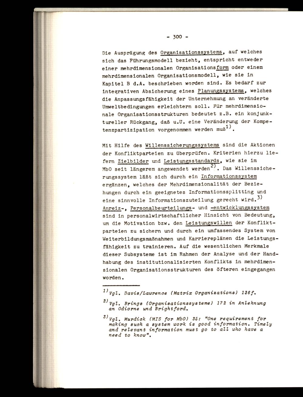 MbO seit längerem angewendet werden“‘., Das Willenssicherungssystem läßt sich durch ein Informationssystem ergänzen, welches der Mehrdimensionalität der Beziehungen durch ein geeignetes Informationssplitting und eine sinnvolle Informationszuteilung gerecht wird.}) Anreiz-, Personalbeurteilungs- und-entwicklungssystem sind in personalwirtschaftlicher Hinsicht von Bedeutung, um die Motivation bzw. den Leistungswillen der Konfliktparteien zu sichern und durch ein umfassendes System von Weiterbildungsmaßnahmen und Karriereplänen die Leistungsfähigkeit zu trainieren. Auf die wesentlichen Merkmale dieser Subsysteme ist im Rahmen der Analyse und der Handhabung des institutionalisierten Konflikts in mehrdimensionalen Organisationsstrukturen des öfteren eingegangen worden.