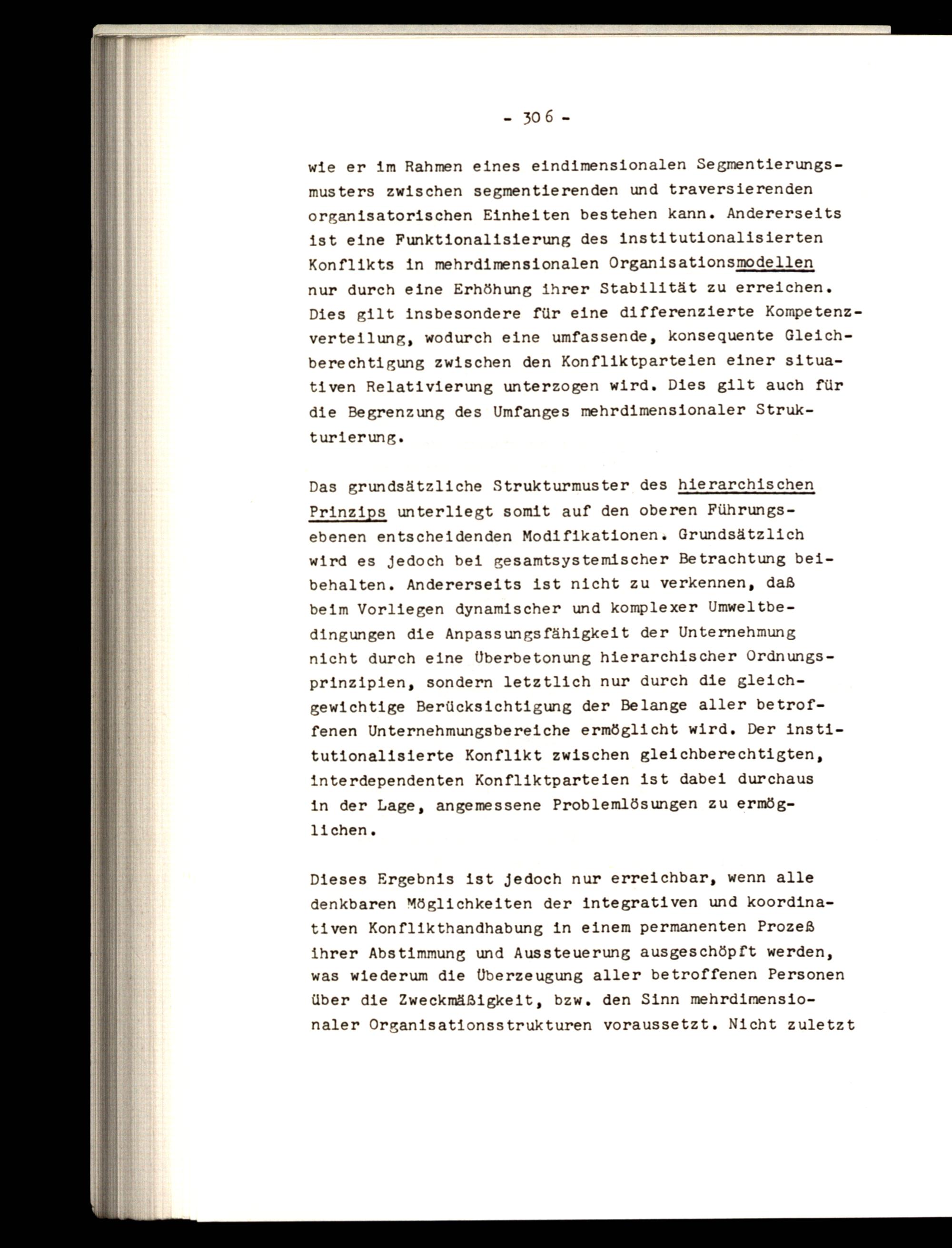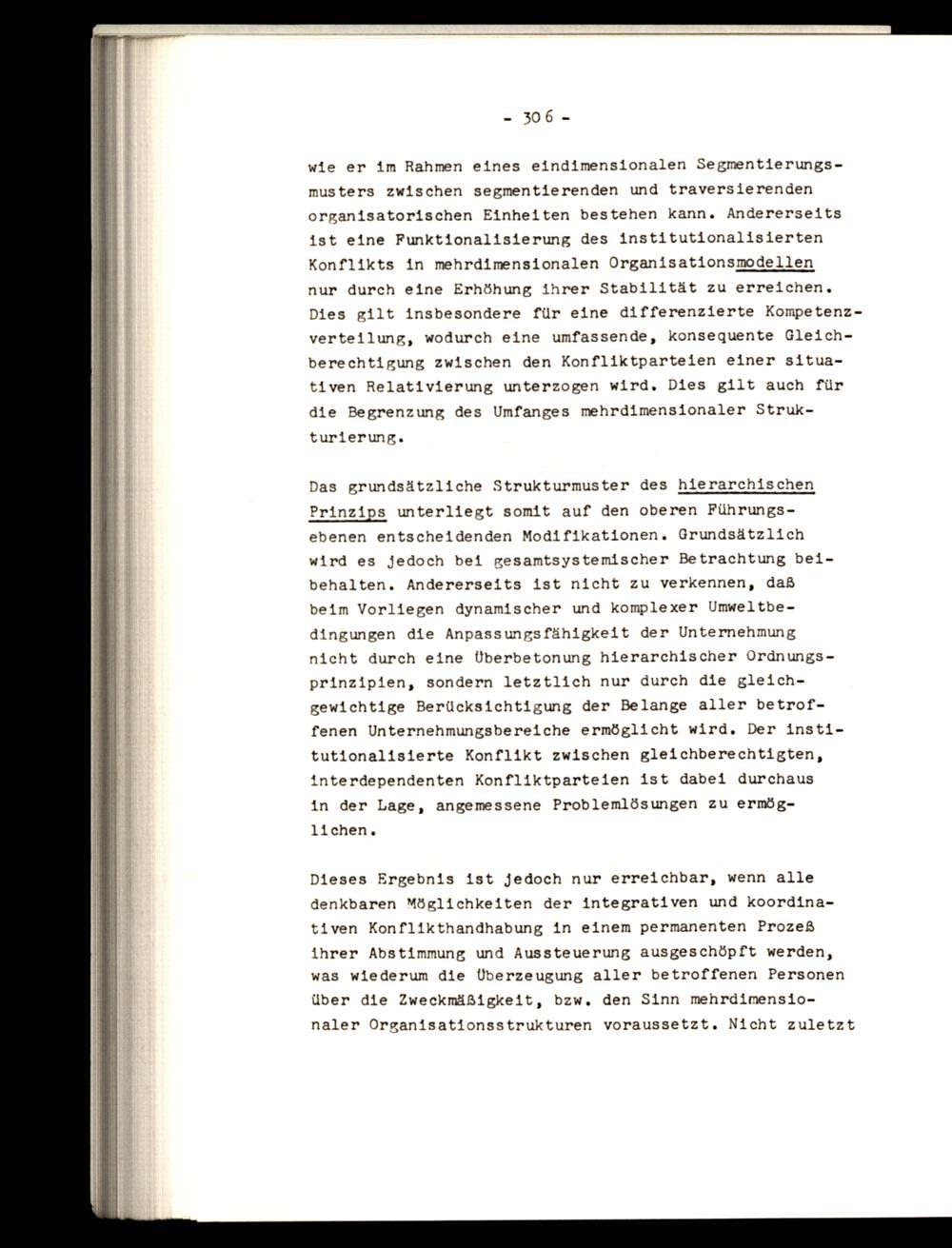 Das grundsätzliche Strukturmuster des hierarchischen Prinzips unterliegt somit auf den oberen Führungsebenen entscheidenden Modifikationen. Grundsätzlich wird es jedoch bei gesamtsystemischer Betrachtung beibehalten. Andererseits ist nicht zu verkennen, daß beim Vorliegen dynamischer und komplexer Umweltbedingungen die Anpassungsfähigkeit der Unternehmung nicht durch eine Überbetonung hierarchischer Ordnungsprinzipien, sondern letztlich nur durch die gleichgewichtige Berücksichtigung der Belange aller betroffenen Unternehmungsbereiche ermöglicht wird, Der institutionalisierte Konflikt zwischen gleichberechtigten, interdependenten Konfliktparteien ist dabei durchaus in der Lage, angemessene Problemlösungen zu ermöglichen,