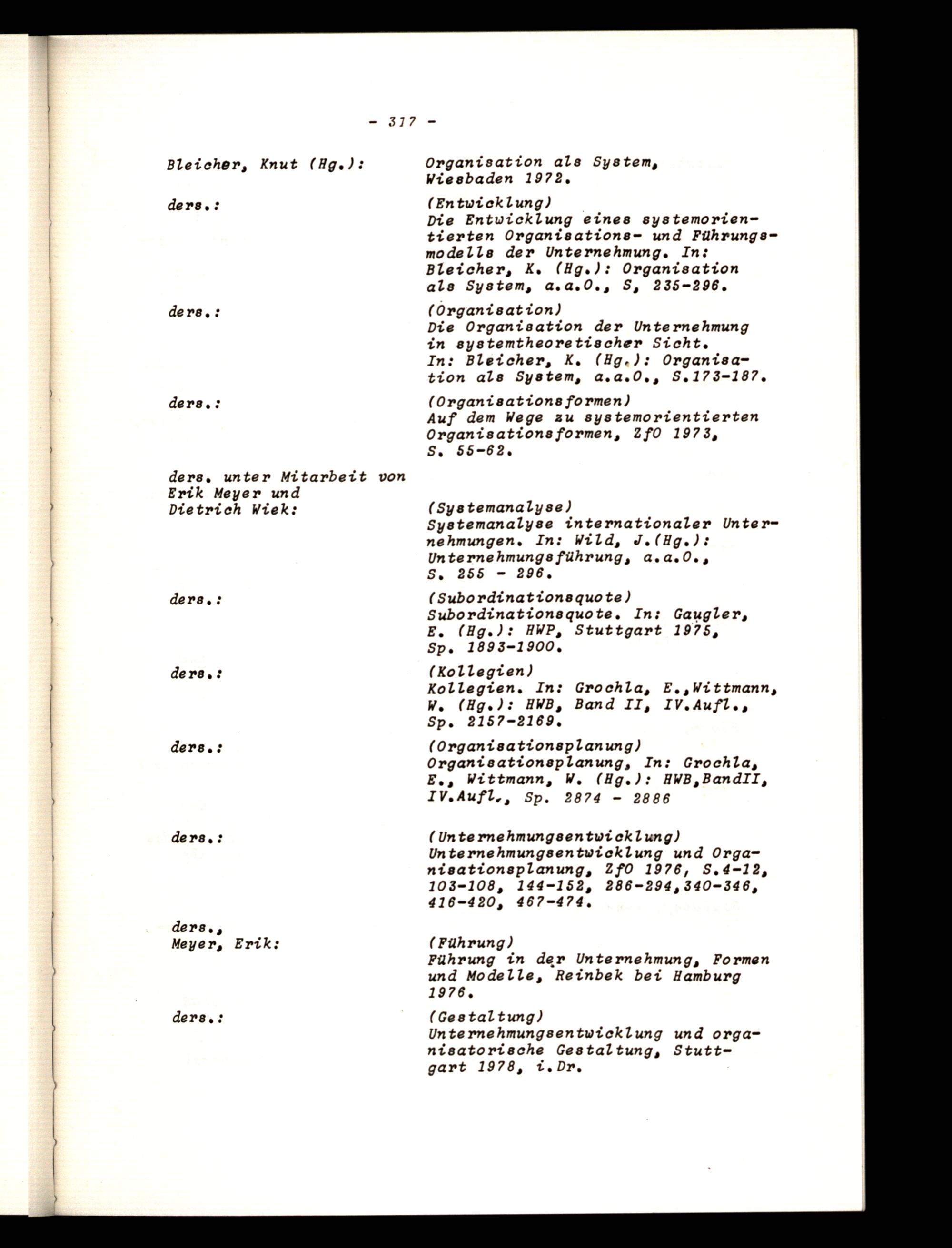 Bleicher, Knut(Hg.J): Organisation als System, Wiesbaden 1972, ders,:(Entwicklung)