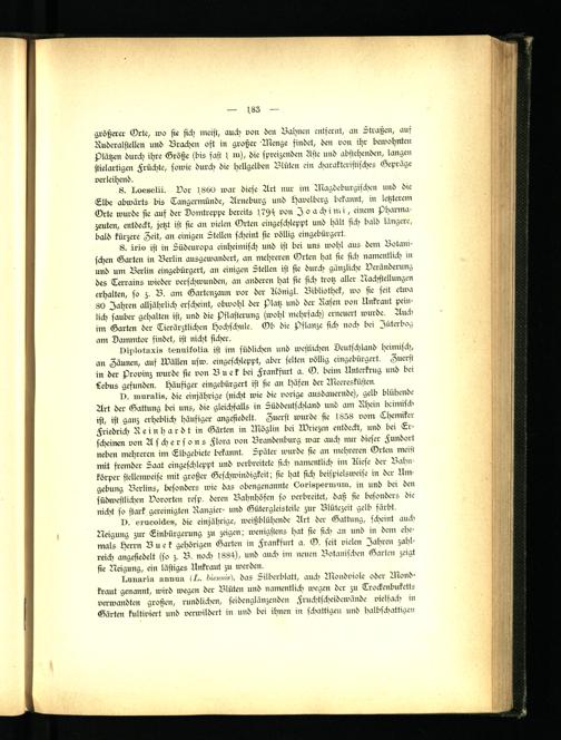 I). m-neoickes, die einjährige, weißblühende Art der Gattung, sckreint auch Neigung zur Einbürgerung zu zeigen; wenigstens hat sie sich an und in dem ehemals Herrn Buek gehörigen Garten in Frankfurt a. O. seit vielen Zähren zahlreich angesiedelt (so z. B. noch > 884), und auch im neuen Botanischen Garten zeigt sie Neigung, ein lästiges Unkraut zu werden.