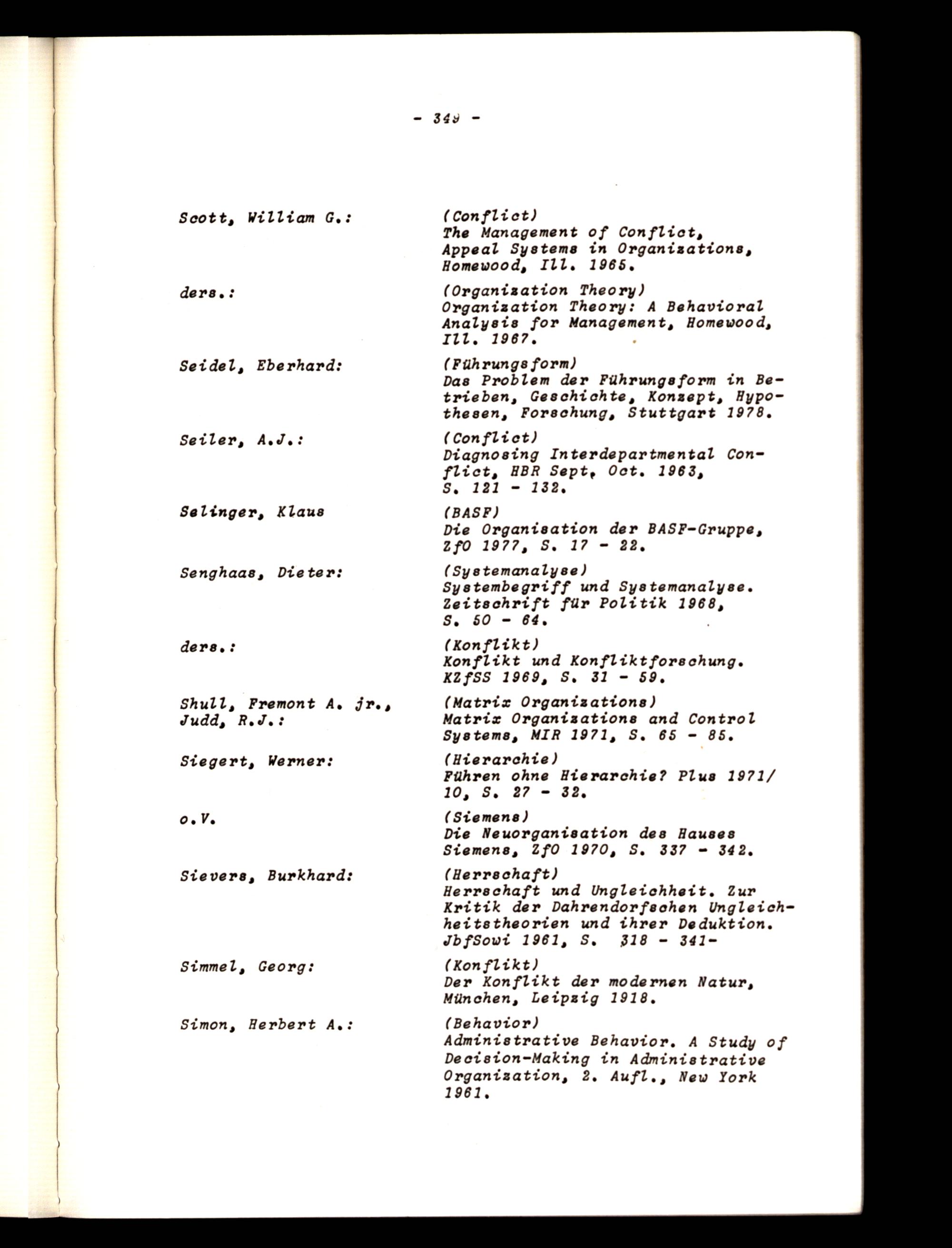 Ss, 50- 64, der8,:(Konflikt) Konflikt und Konfliktforschung. KZfSS 1969, S, 31- 59, Shull, Fremont A, jr.,(Matrix Organizations) Judd, R.dJ.? Matrix Organizations and Control Systems, MIR 1971, S, 65- 85, Siegert, Werner:(Hierarchie)
