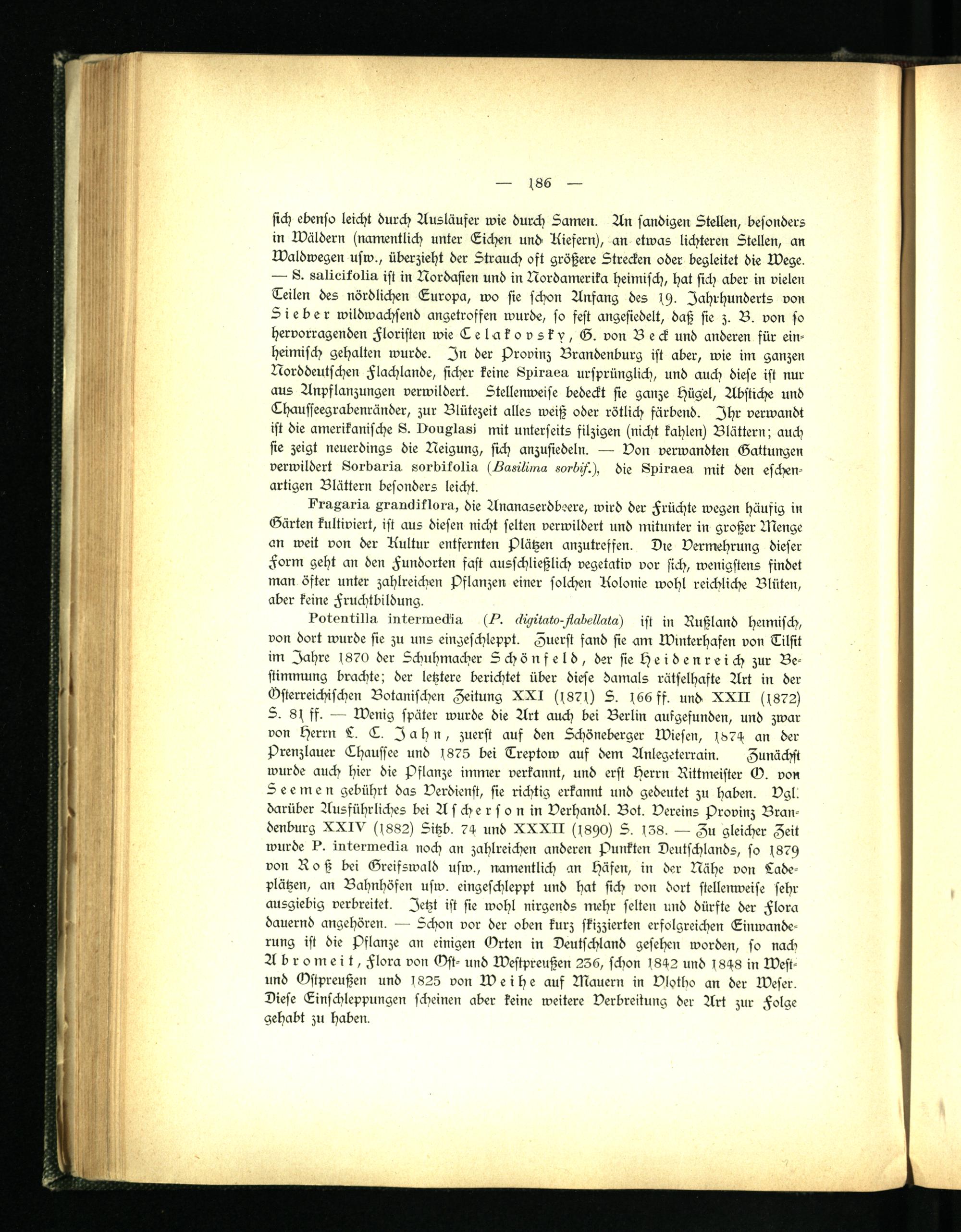 von dort wurde sie zu uns eingeschleppt. Zuerst fand sie am Winterhafen von Tilsit im Jahre f870 der Schuhmacher Schönfeld, der sie h e i d e n r e i ch zur Bestimmung brachte; der letztere berichtet über diese damals rätselhafte Art in der Österreichischen Botanisä?en Zeitung XXI (f87l) S. f66 ff. und XXII (f872) S. 8( ff. — Wenig später wurde die Art auch bei Berlin ausgesunden, und zwar von Herrn L. E. Jahn, zuerst auf den Schöneberger Wiesen, 1874 an der Prenzlauer Thaussee und 1875 bei Treptow auf dem Anlegeterrain. Zunächst wurde auch hier die Pflanze immer verkannt, und erst Herrn Rittmeister O. von Seemen gebührt das Verdienst, sie richtig erkannt und gedeutet zu haben. Vgl. darüber Ausführliches bei Aschersonin Verhandl. Bot. Vereins Provinz Brandenburg XXIV P882) Sitzb. 74- und XXXII (l8siO) S. f38. — Zu gleicher Zeit wurde ?. intsrmeäin noch an zahlreichen anderen Punkten Deutschlands, so f879 von Roß bei Greifswald usw., namentlich an Häfen, in der Nähe von Ladeplätzen, an Bahnhöfen usw. eingeschleppt und hat sich von dort stellenweise sehr- ausgiebig verbreitet. Jetzt ist sie wohl nirgends mehr selten und dürfte der Flora dauernd angehören. — Schon vor der oben kurz skizzierten erfolgreichen Einwanderung ist die Pflanze an einigen Grien in Deutschland gesehen worden, so nach Abromeit, Flora von Gst- und Westpreußen 236, schon > 842 und 1848 in West- und Ostpreußen und >825 von Weihe auf Mauern in Vlotbo an der Weser. Diese Einschleppungen scbeinen aber keine weitere Verbreitung der Art zur Folge gehabt zri haben.