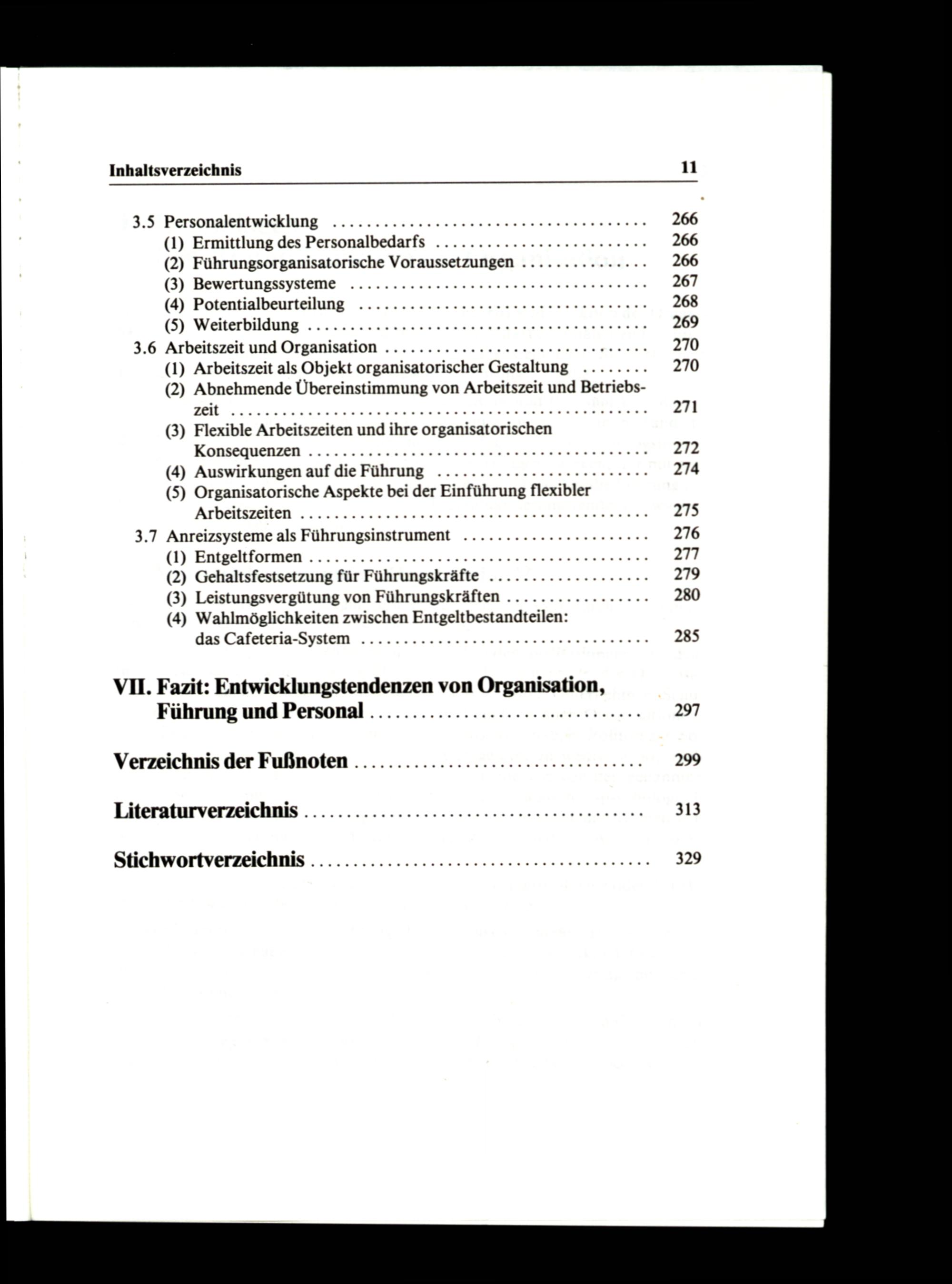 Inhaltsverzeichnis 11 3.5 Personalentwicklung.........00000000000000 En 266 (1) Ermittlung des Personalbedarfs...............00000000000 266 (2) Führungsorganisatorische Voraussetzungen............... 266 (3) Bewertungssystem®................00001110000 00110000 267 (4) Potentialbeurteilung...............00210000r 400440400 268 (S) Weiterbildung..............000000000011 EEG 269 3.6 Arbeitszeit und Organisation............0.0000000000000 HEHE 270 (1) Arbeitszeit als Objekt organisatorischer Gestaltung........ 270 (2) Abnehmende Übereinstimmung von Arbeitszeit und BetriebsEr 271 (3) Flexible Arbeitszeiten und ihre organisatorischen KOnsequenZeN..................00001011 1.0000 102200008 272 (4) Auswirkungen auf die Führung...........0.0000000000000 274 (5) Organisatorische Aspekte bei der Einführung flexibler Arbeitszeiten.............00.220000 herr tree EE ae 275 3.7 Anreizsysteme als Führungsinstrument............0.0000000000 276 (1) Entgeltformen..........00000000000000 0ER 217 (2) Gehaltsfestsetzung für Führungskräfte..................- 279 (3) Leistungsvergütung von Führungskräften................- 280 (4) Wahlmöglichkeiten zwischen Entgeltbestandteilen: das Cafeteria-System..........0.0000000000 000 Een 285 VI. Fazit: Entwicklungstendenzen von Organisation,