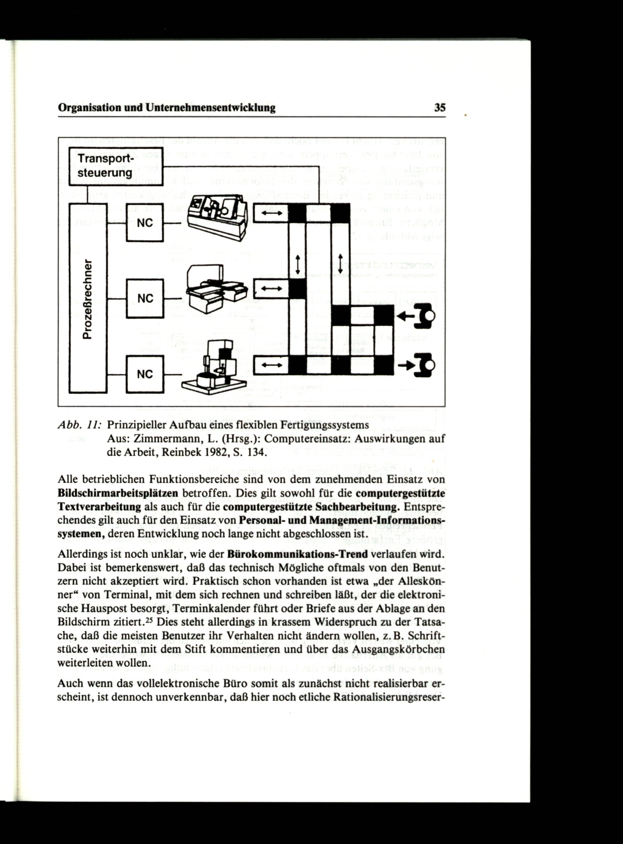 Abb. 11: Prinzipieller Aufbau eines flexiblen Fertigungssystems Aus: Zimmermann, L.(Hrsg.): Computereinsatz: Auswirkungen auf die Arbeit, Reinbek 1982, S. 134.