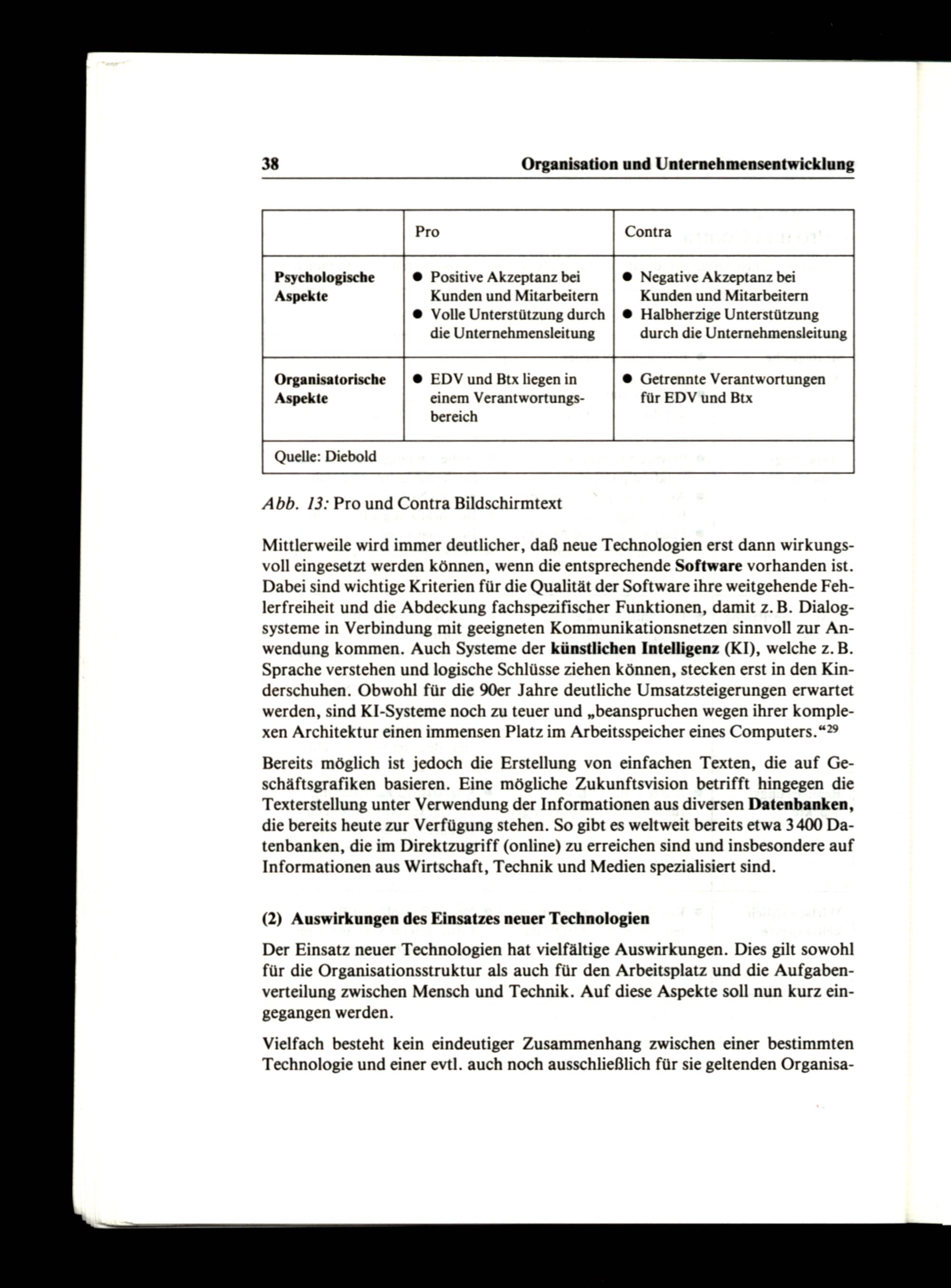 Mittlerweile wird immer deutlicher, daß neue Technologien erst dann wirkungsvoll eingesetzt werden können, wenn die entsprechende Software vorhanden ist. Dabei sind wichtige Kriterien für die Qualität der Software ihre weitgehende Fehlerfreiheit und die Abdeckung fachspezifischer Funktionen, damit z. B. Dialogsysteme in Verbindung mit geeigneten Kommunikationsnetzen sinnvoll zur Anwendung kommen. Auch Systeme der künstlichen Intelligenz(KI), welche z.B. Sprache verstehen und logische Schlüsse ziehen können, stecken erst in den Kinderschuhen. Obwohl für die 90er Jahre deutliche Umsatzsteigerungen erwartet werden, sind KI-Systeme noch zu teuer und„beanspruchen wegen ihrer komplexen Architektur einen immensen Platz im Arbeitsspeicher eines Computers.“?
