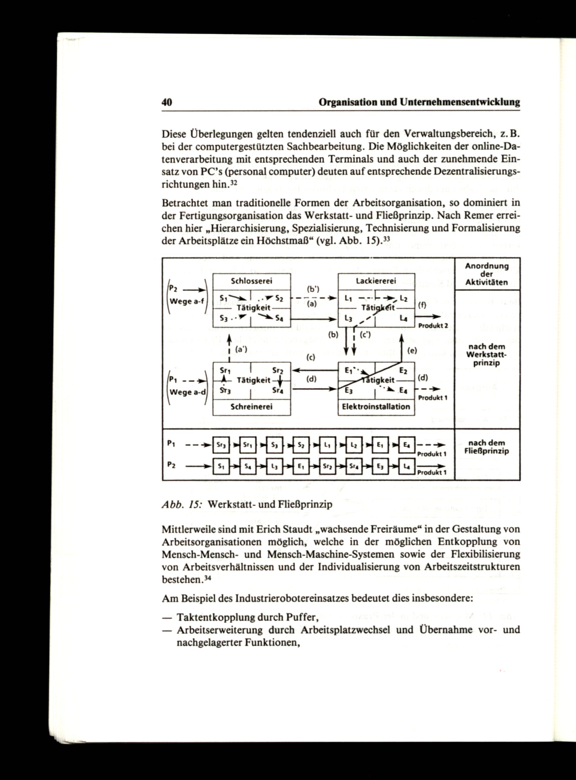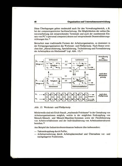 Betrachtet man traditionelle Formen der Arbeitsorganisation, so dominiert in der Fertigungsorganisation das Werkstatt- und Fließprinzip. Nach Remer erreichen hier„Hierarchisierung, Spezialisierung, Technisierung und Formalisierung der Arbeitsplätze ein Höchstmaß“(vgl. Abb. 15).3