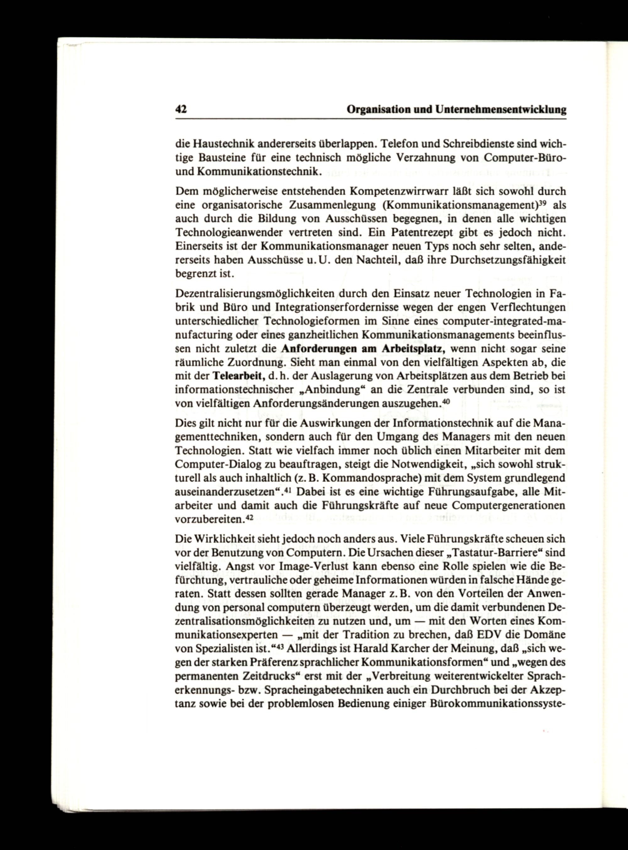 Die Wirklichkeit sieht jedoch noch anders aus. Viele Führungskräfte scheuen sich vor der Benutzung von Computern. Die Ursachen dieser„Tastatur-Barriere“ sind vielfältig. Angst vor Image-Verlust kann ebenso eine Rolle spielen wie die Befürchtung, vertrauliche oder geheime Informationen würden in falsche Hände geraten. Statt dessen sollten gerade Manager z.B. von den Vorteilen der Anwendung von personal computern überzeugt werden, um die damit verbundenen Dezentralisationsmöglichkeiten zu nutzen und, um— mit den Worten eines Kommunikationsexperten—„mit der Tradition zu brechen, daß EDV die Domäne von Spezialisten ist.“ Allerdings ist Harald Karcher der Meinung, daß„sich wegen der starken Präferenz sprachlicher Kommunikationsformen“ und„wegen des permanenten Zeitdrucks“ erst mit der„Verbreitung weiterentwickelter Spracherkennungs- bzw. Spracheingabetechniken auch ein Durchbruch bei der Akzeptanz sowie bei der problemlosen Bedienung einiger Bürokommunikationssyste