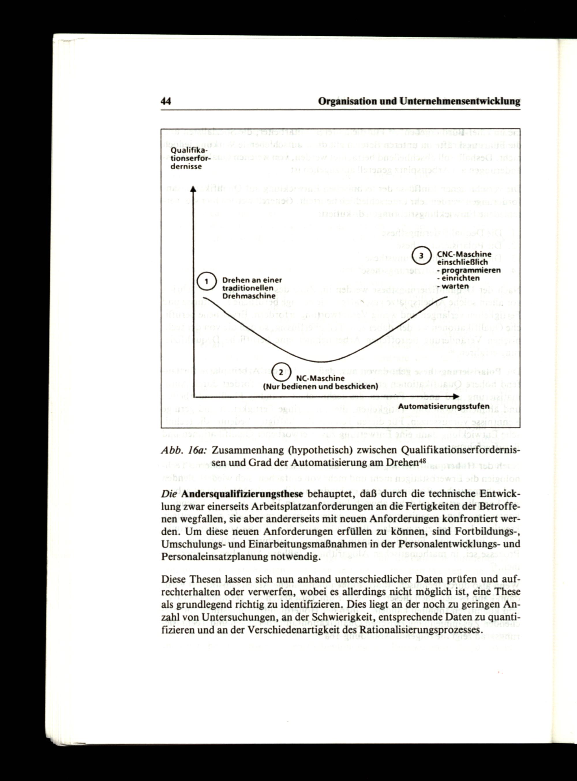 Die Andersqualifizierungsthese behauptet, daß durch die technische Entwicklung zwar einerseits Arbeitsplatzanforderungen an die Fertigkeiten der Betroffenen wegfallen, sie aber andererseits mit neuen Anforderungen konfrontiert werden. Um diese neuen Anforderungen erfüllen zu können, sind Fortbildungs-, Umschulungs- und Einarbeitungsmaßnahmen in der Personalentwicklungs- und Personaleinsatzplanung notwendig.