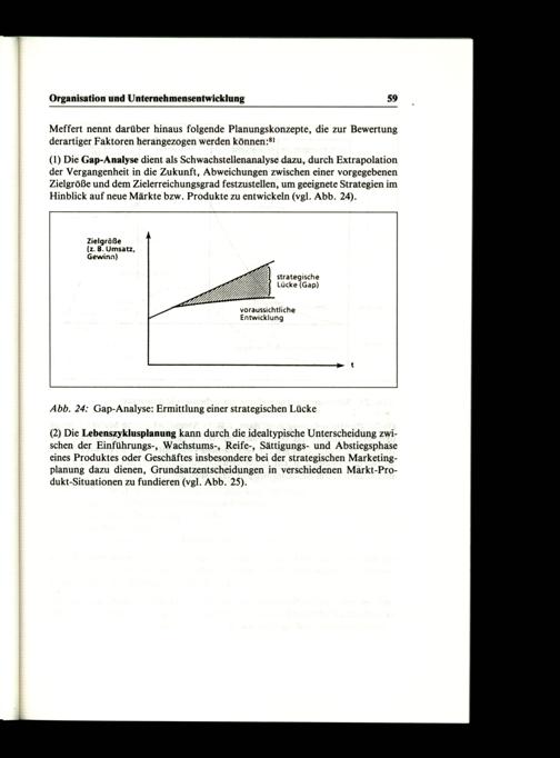 (1) Die Gap-Analyse dient als Schwachstellenanalyse dazu, durch Extrapolation der Vergangenheit in die Zukunft, Abweichungen zwischen einer vorgegebenen Zielgröße und dem Zielerreichungsgrad festzustellen, um geeignete Strategien im Hinblick auf neue Märkte bzw. Produkte zu entwickeln(vgl. Abb. 24).