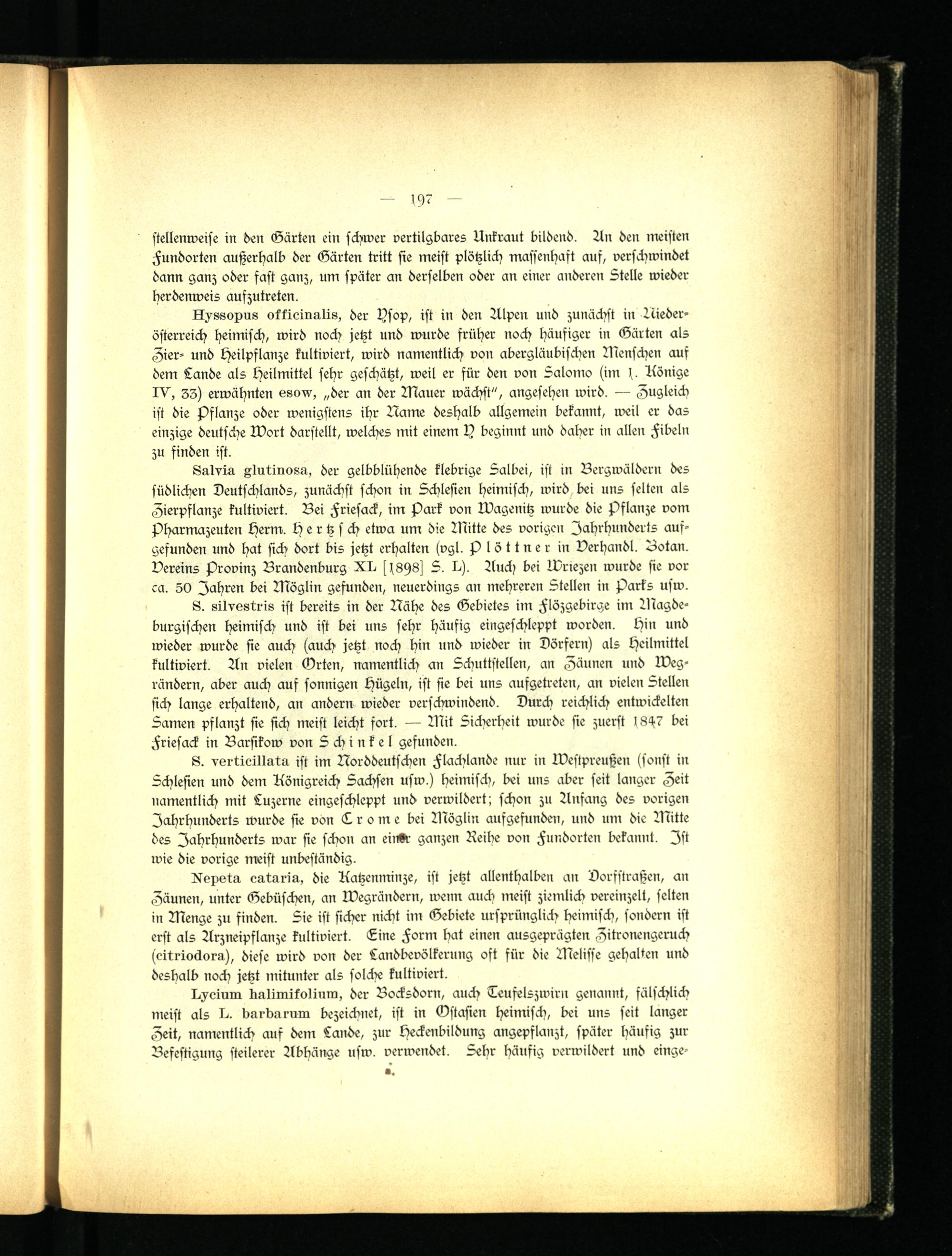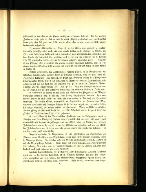 Xepeta eataria, die Katzenminze, ist jetzt allenthalben an Dorfstraßen, an Zäunen, unter Gebüschen, an Wegrändern, wenn auch meist ziemlich vereinzelt, selten in Menge zu finden. Sie ist sicher nicht im Gebiete ursprünglich heimisch, sondern ist erst als Arzneipflanze kultiviert. Line Form hat einen ausgeprägten Zitronengeruch (eitriockora), diese wird von der Landbevölkerung oft für die Melisse gehalten und desbalb noch jetzt mitunter als solche kultiviert.