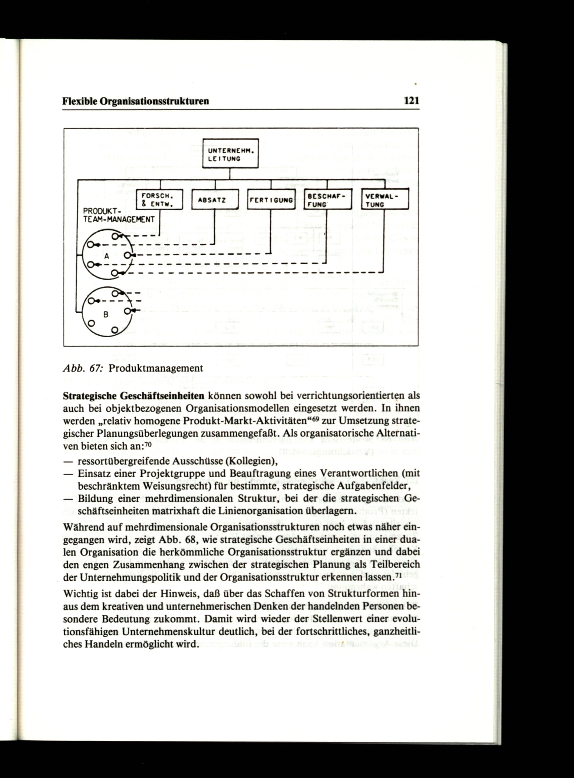 Während auf mehrdimensionale Organisationsstrukturen noch etwas näher eingegangen wird, zeigt Abb. 68, wie strategische Geschäftseinheiten in einer dualen Organisation die herkömmliche Organisationsstruktur ergänzen und dabei den engen Zusammenhang zwischen der strategischen Planung als Teilbereich der Unternehmungspolitik und der Organisationsstruktur erkennen lassen.?!