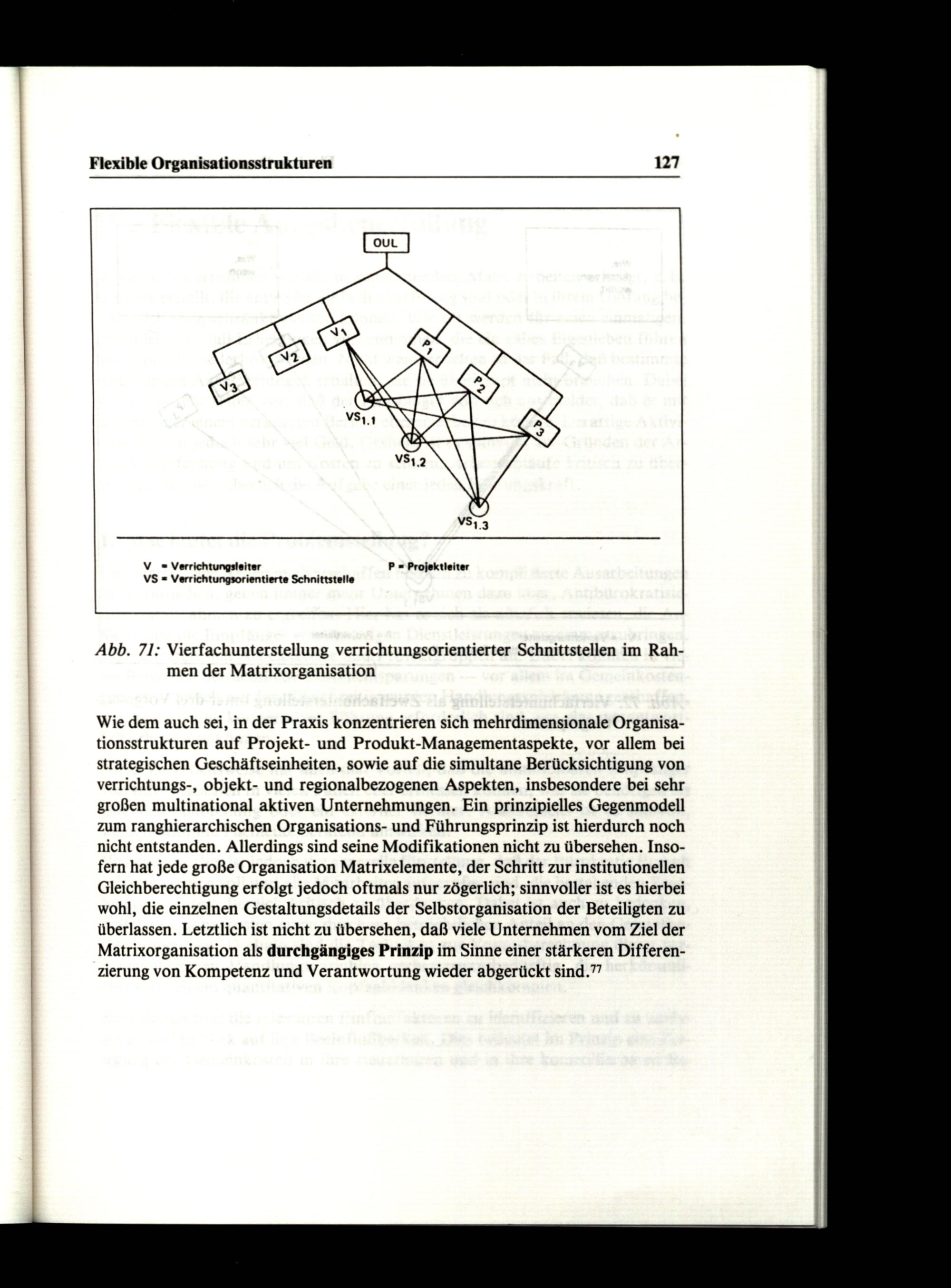 Wie dem auch sei, in der Praxis konzentrieren sich mehrdimensionale Organisationsstrukturen auf Projekt- und Produkt-Managementaspekte, vor allem bei strategischen Geschäftseinheiten, sowie auf die simultane Berücksichtigung von verrichtungs-, objekt- und regionalbezogenen Aspekten, insbesondere bei sehr großen multinational aktiven Unternehmungen. Ein prinzipielles Gegenmodell zum ranghierarchischen Organisations- und Führungsprinzip ist hierdurch noch nicht entstanden. Allerdings sind seine Modifikationen nicht zu übersehen. Insofern hat jede große Organisation Matrixelemente, der Schritt zur institutionellen Gleichberechtigung erfolgt jedoch oftmals nur zögerlich; sinnvoller ist es hierbei wohl, die einzelnen Gestaltungsdetails der Selbstorganisation der Beteiligten zu überlassen. Letztlich ist nicht zu übersehen, daß viele Unternehmen vom Ziel der Matrixorganisation als durchgängiges Prinzip im Sinne einer stärkeren Differenzierung von Kompetenz und Verantwortung wieder abgerückt sind.?7