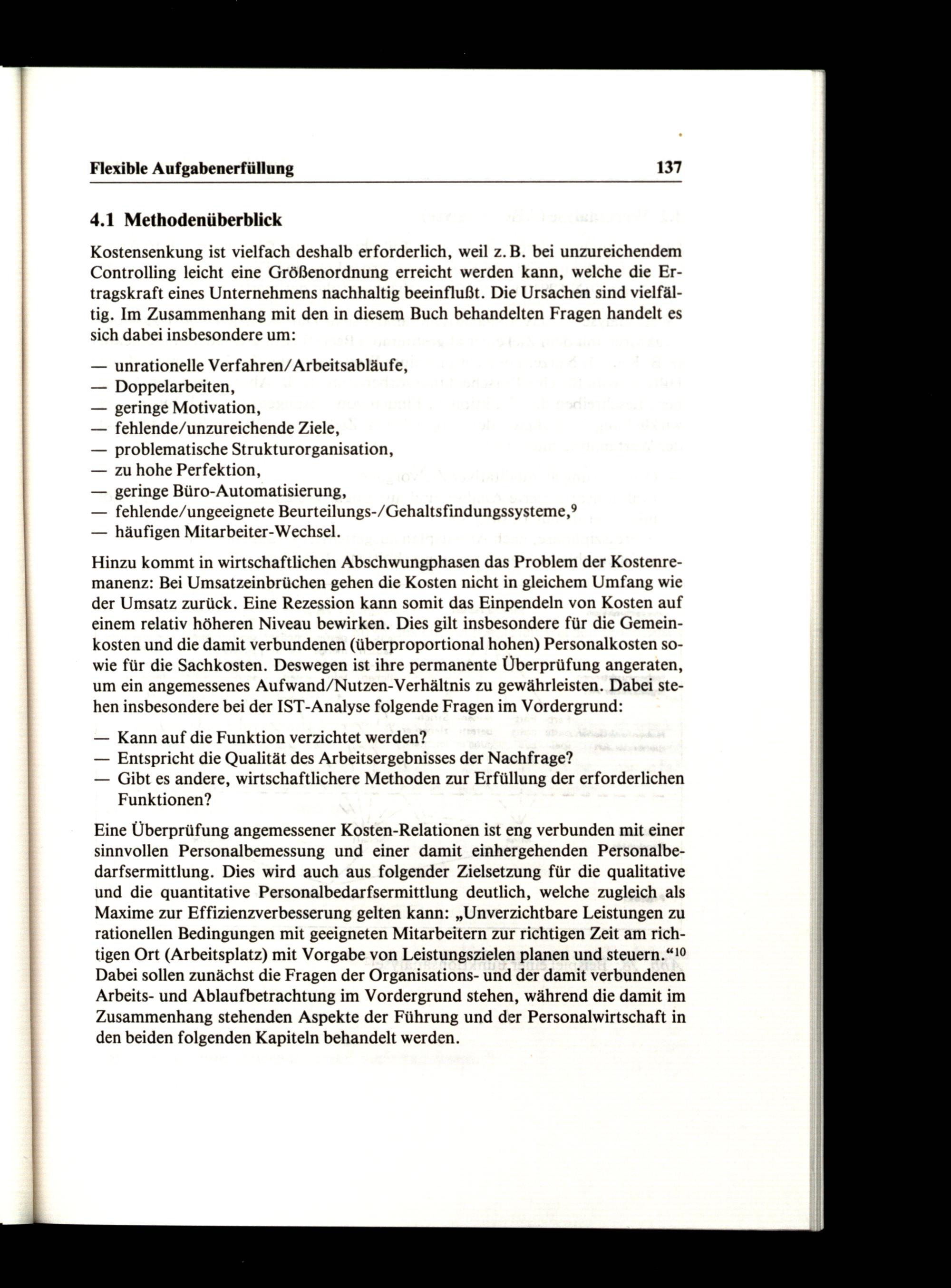 Eine Überprüfung angemessener Kosten-Relationen ist eng verbunden mit einer sinnvollen Personalbemessung und einer damit einhergehenden Personalbedarfsermittlung. Dies wird auch aus folgender Zielsetzung für die qualitative und die quantitative Personalbedarfsermittlung deutlich, welche zugleich als Maxime zur Effizienzverbesserung gelten kann:„Unverzichtbare Leistungen zu rationellen Bedingungen mit geeigneten Mitarbeitern zur richtigen Zeit am richtigen Ort(Arbeitsplatz) mit Vorgabe von Leistungszielen planen und steuern.“10 Dabei sollen zunächst die Fragen der Organisations- und der damit verbundenen Arbeits- und Ablaufbetrachtung im Vordergrund stehen, während die damit im Zusammenhang stehenden Aspekte der Führung und der Personalwirtschaft in den beiden folgenden Kapiteln behandelt werden.