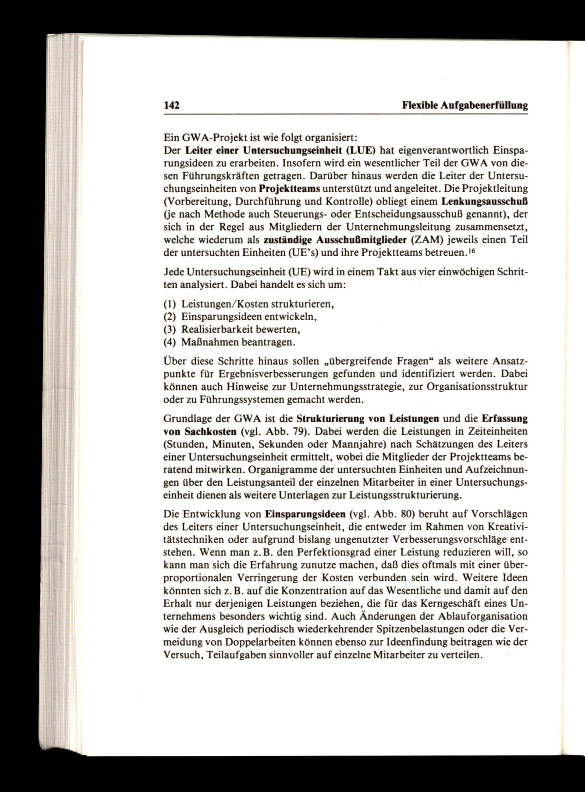Der Leiter einer Untersuchungseinheit(LUE) hat eigenverantwortlich Einsparungsideen zu erarbeiten. Insofern wird ein wesentlicher Teil der GWA von diesen Führungskräften getragen. Darüber hinaus werden die Leiter der Untersuchungseinheiten von Projektteams unterstützt und angeleitet. Die Projektleitung (Vorbereitung, Durchführung und Kontrolle) obliegt einem Lenkungsausschuß Ge nach Methode auch Steuerungs- oder Entscheidungsausschuß genannt), der sich in der Regel aus Mitgliedern der Unternehmungsleitung zusammensetzt, welche wiederum als zuständige Ausschußmitglieder(ZAM) jeweils einen Teil der untersuchten Einheiten(UE’s) und ihre Projektteams betreuen.!®