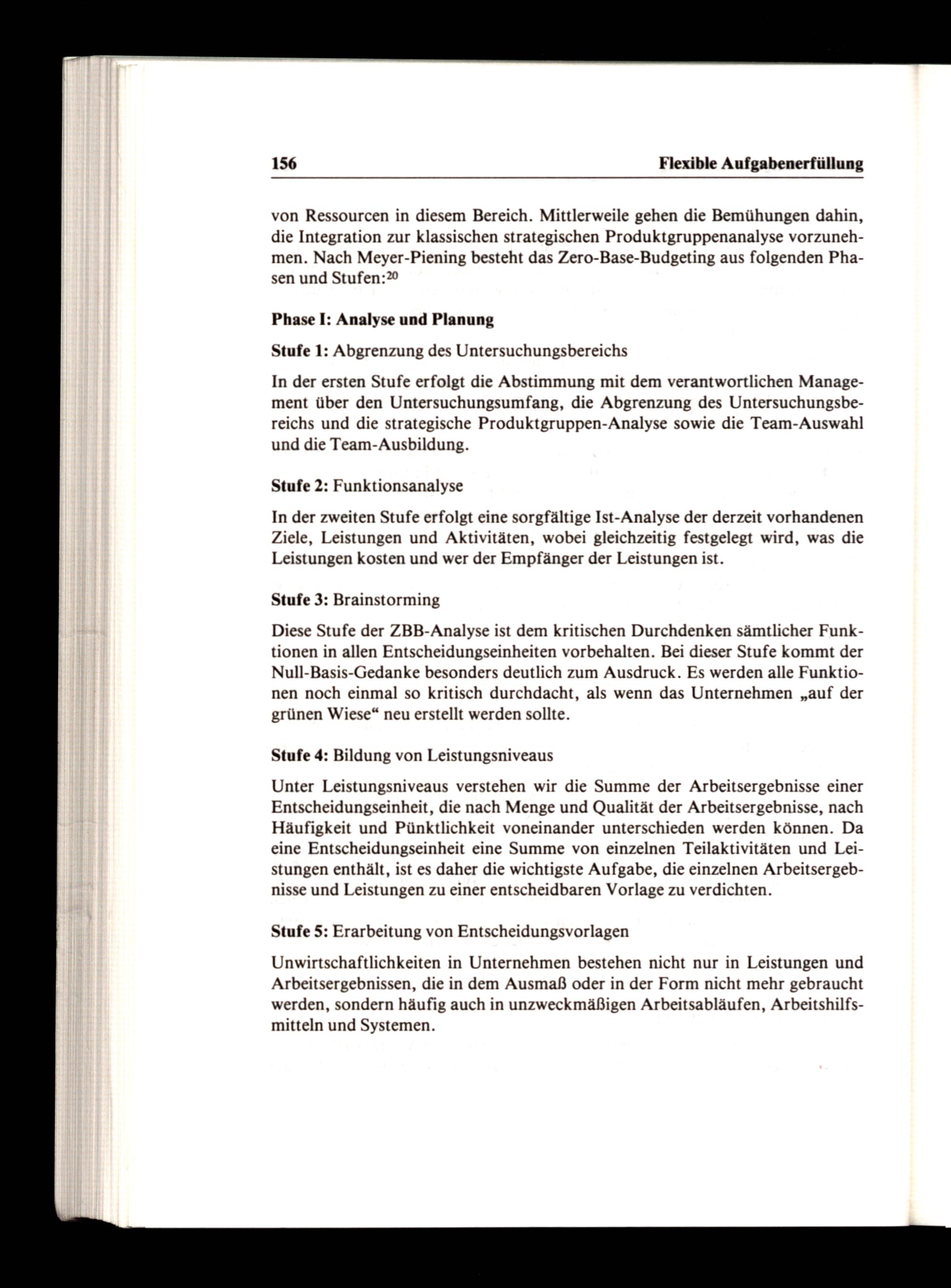 von Ressourcen in diesem Bereich. Mittlerweile gehen die Bemühungen dahin, die Integration zur klassischen strategischen Produktgruppenanalyse vorzunehmen. Nach Meyer-Piening besteht das Zero-Base-Budgeting aus folgenden Phasen und Stufen:2°