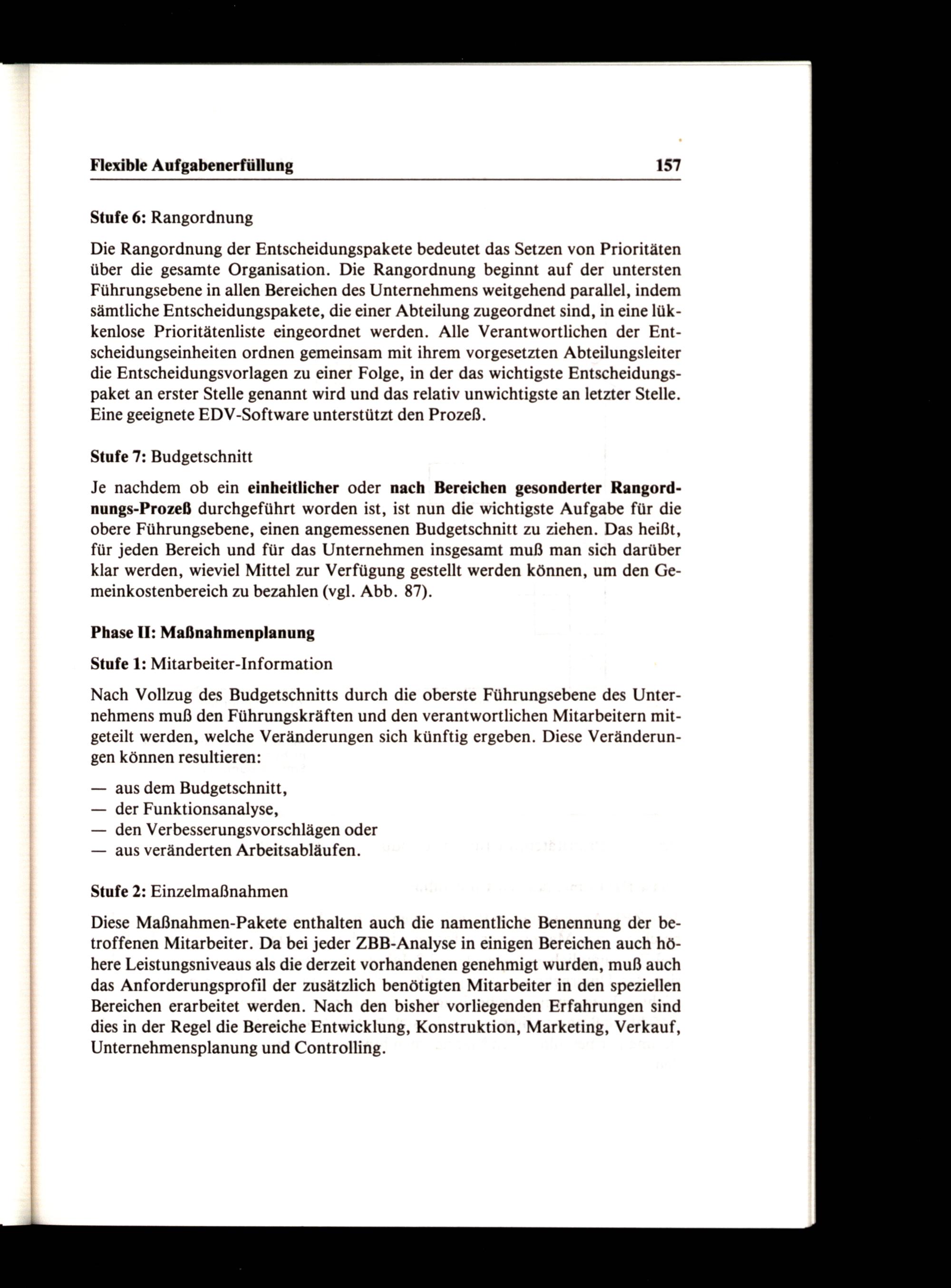 Diese Maßnahmen-Pakete enthalten auch die namentliche Benennung der betroffenen Mitarbeiter. Da bei jeder ZBB-Analyse in einigen Bereichen auch höhere Leistungsniveaus als die derzeit vorhandenen genehmigt wurden, muß auch das Anforderungsprofil der zusätzlich benötigten Mitarbeiter in den speziellen Bereichen erarbeitet werden. Nach den bisher vorliegenden Erfahrungen sind dies in der Regel die Bereiche Entwicklung, Konstruktion, Marketing, Verkauf, Unternehmensplanung und Controlling.