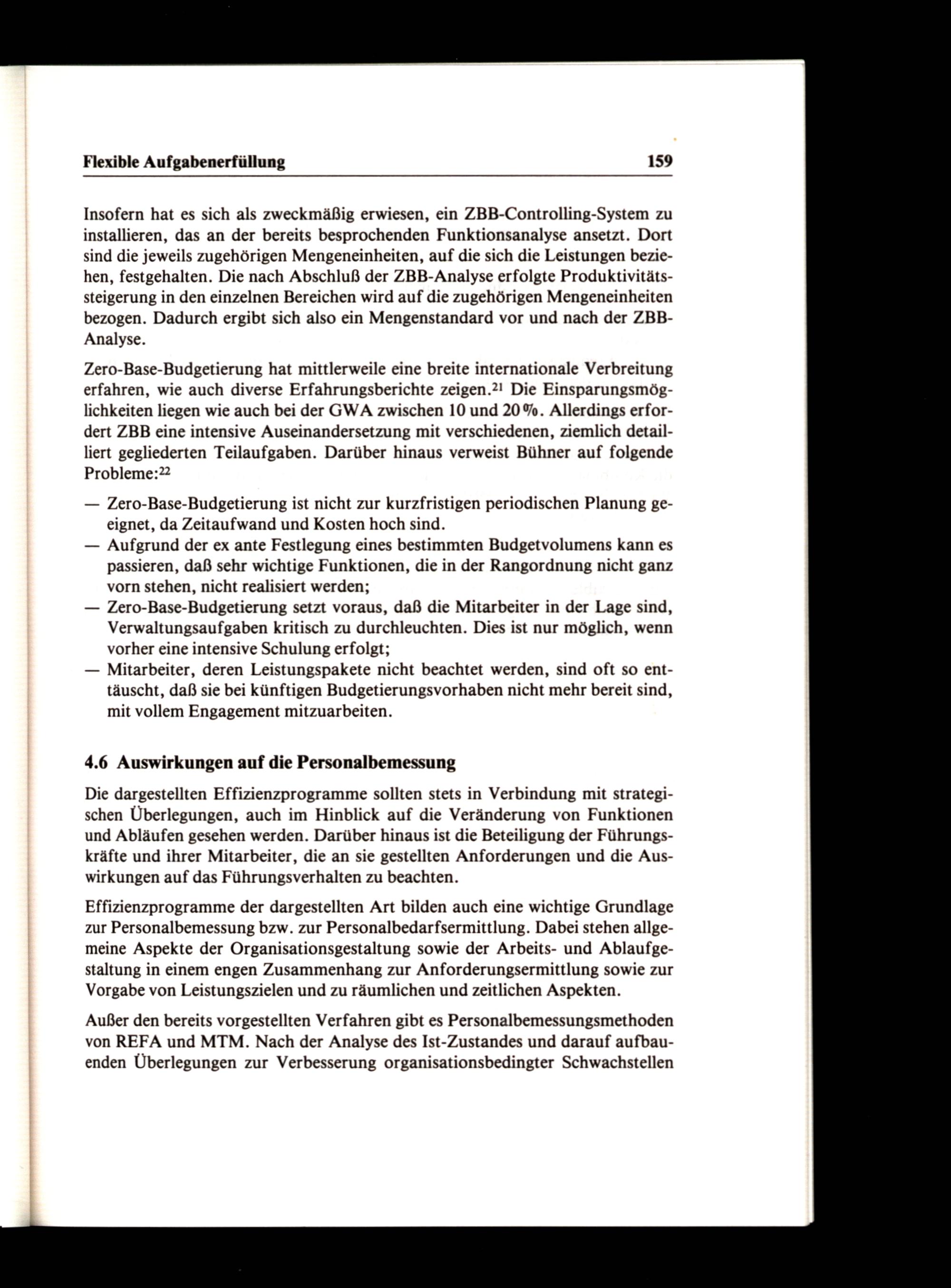 Zero-Base-Budgetierung hat mittlerweile eine breite internationale Verbreitung erfahren, wie auch diverse Erfahrungsberichte zeigen.?! Die Einsparungsmöglichkeiten liegen wie auch bei der GWA zwischen 10 und 20%. Allerdings erfordert ZBB eine intensive Auseinandersetzung mit verschiedenen, ziemlich detailliert gegliederten Teilaufgaben. Darüber hinaus verweist Bühner auf folgende Probleme: 22