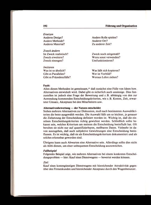 Allen diesen Methoden ist gemeinsam,*! daß zunächst eine Fülle von Ideen bzw. Alternativen entwickelt wird. Dabei gibt es sicherlich auch unsinnige. Dies festzustellen ist jedoch eine Frage der Bewertung und z.B. abhängig von den zur Anwendung kommenden Entscheidungskriterien, wie z.B. Kosten, Zeit, erwarteter Umsatz, Akzeptanz bei den Mitarbeitern usw.