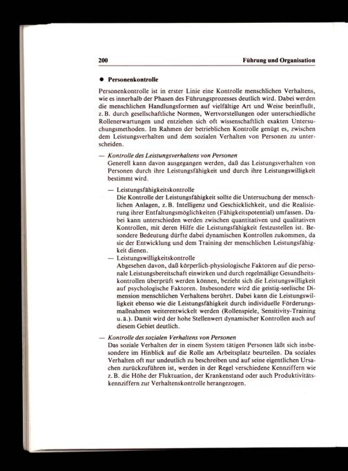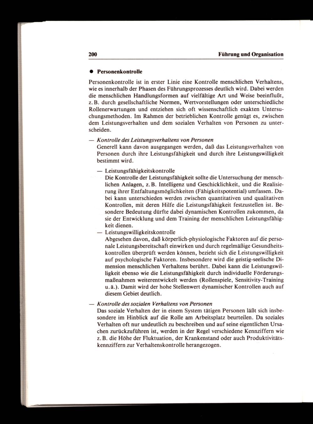 Personenkontrolle ist in erster Linie eine Kontrolle menschlichen Verhaltens, wie es innerhalb der Phasen des Führungsprozesses deutlich wird. Dabei werden die menschlichen Handlungsformen auf vielfältige Art und Weise beeinflußt, z.B. durch gesellschaftliche Normen, Wertvorstellungen oder unterschiedliche Rollenerwartungen und entziehen sich oft wissenschaftlich exakten Untersuchungsmethoden. Im Rahmen der betrieblichen Kontrolle genügt es, zwischen dem Leistungsverhalten und dem sozialen Verhalten von Personen zu unterscheiden.