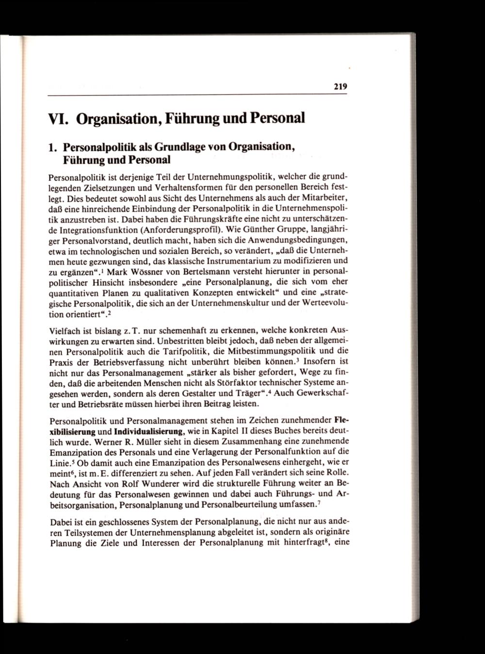 Personalpolitik und Personalmanagement stehen im Zeichen zunehmender Flexibilisierung und Individualisierung, wie in Kapitel II dieses Buches bereits deutlich wurde. Werner R. Müller sieht in diesem Zusammenhang eine zunehmende Emanzipation des Personals und eine Verlagerung der Personalfunktion auf die Linie.$ Ob damit auch eine Emanzipation des Personalwesens einhergeht, wie er meint®, ist m. E. differenziert zu sehen. Auf jeden Fall verändert sich seine Rolle. Nach Ansicht von Rolf Wunderer wird die strukturelle Führung weiter an Bedeutung für das Personalwesen gewinnen und dabei auch Führungs- und Arbeitsorganisation, Personalplanung und Personalbeurteilung umfassen.’
