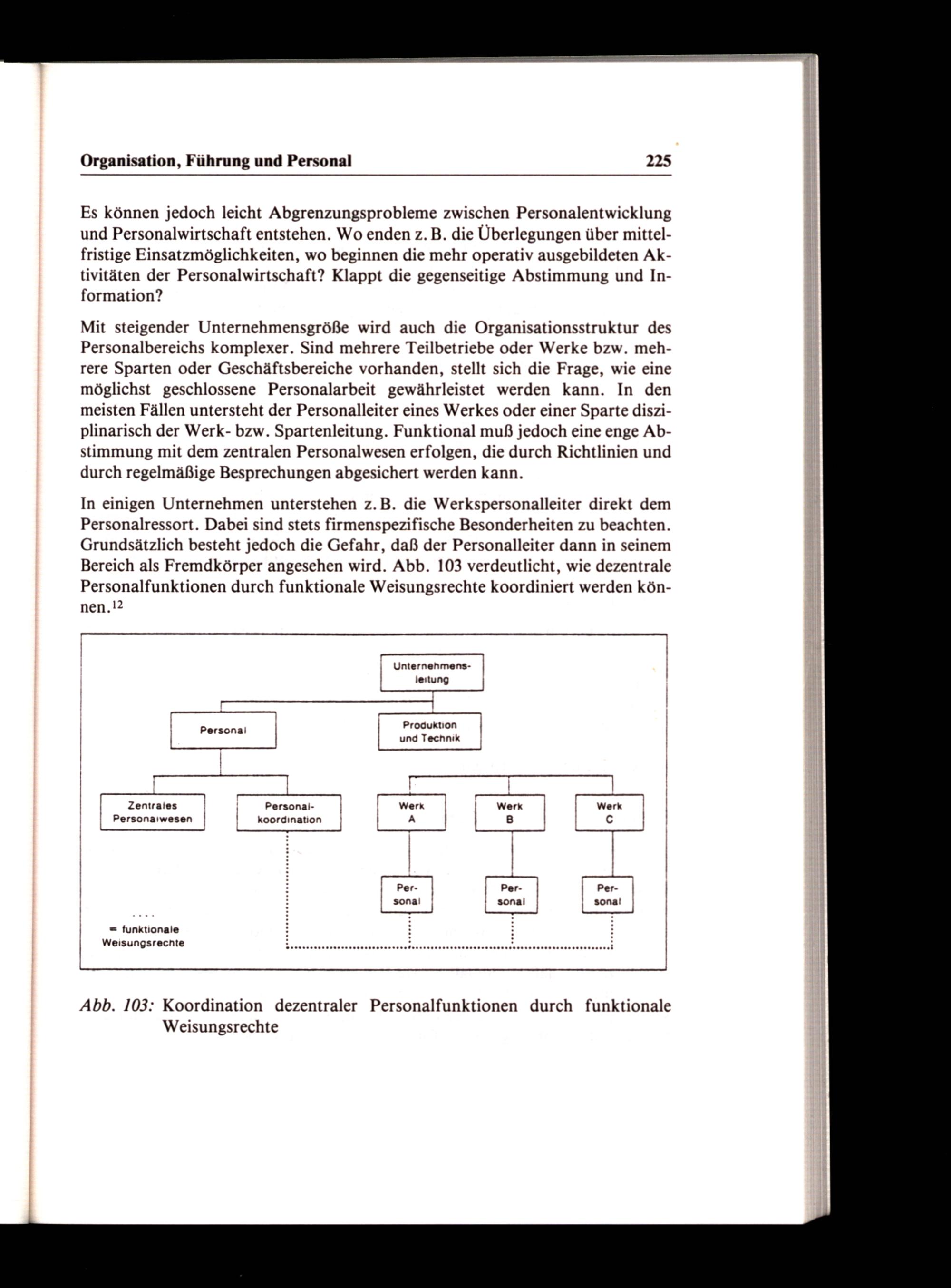 In einigen Unternehmen unterstehen z.B. die Werkspersonalleiter direkt dem Personalressort. Dabei sind stets firmenspezifische Besonderheiten zu beachten. Grundsätzlich besteht jedoch die Gefahr, daß der Personalleiter dann in seinem Bereich als Fremdkörper angesehen wird. Abb. 103 verdeutlicht, wie dezentrale Personalfunktionen durch funktionale Weisungsrechte koordiniert werden können.!2