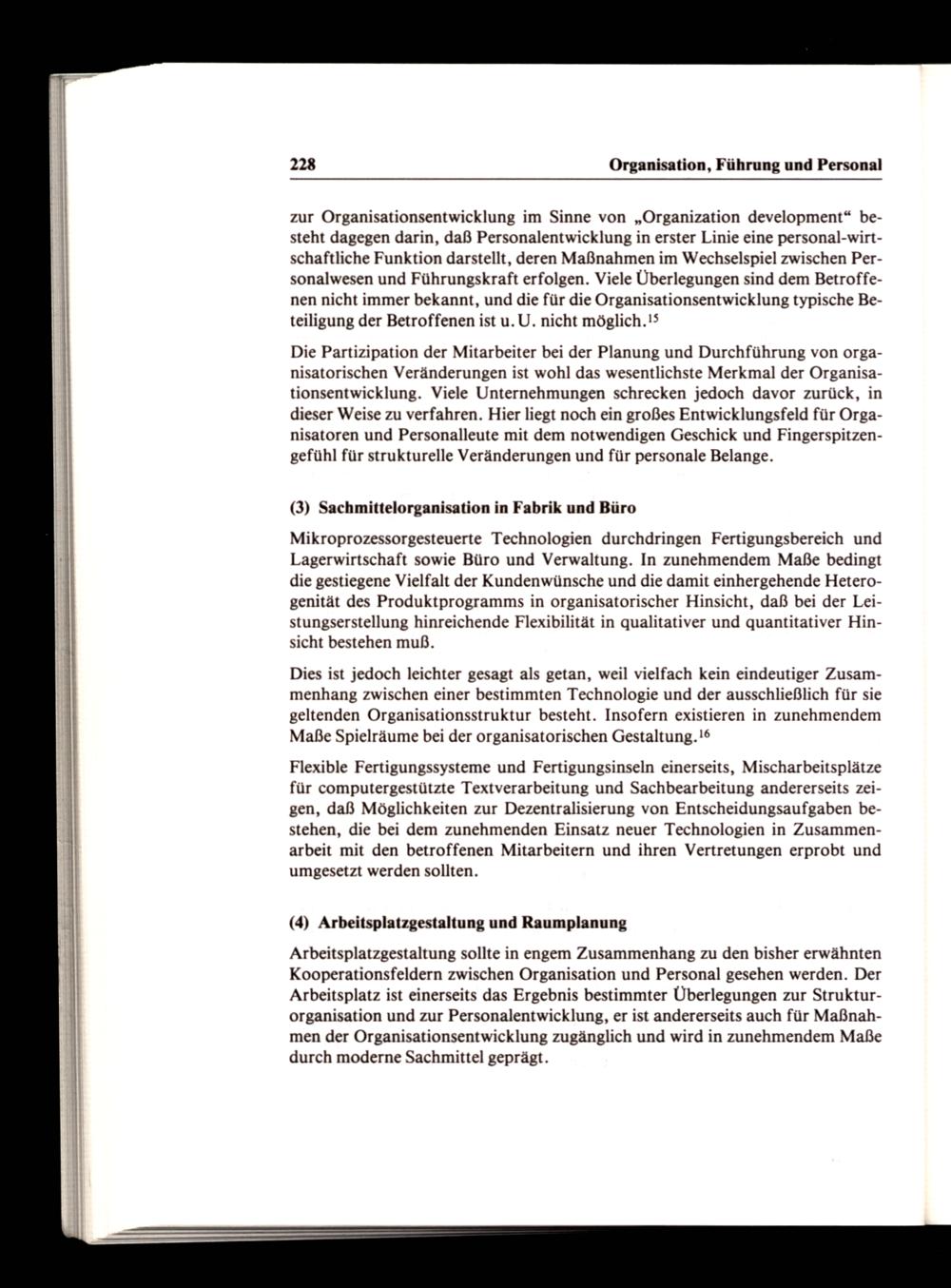 Arbeitsplatzgestaltung sollte in engem Zusammenhang zu den bisher erwähnten Kooperationsfeldern zwischen Organisation und Personal gesehen werden. Der Arbeitsplatz ist einerseits das Ergebnis bestimmter Überlegungen zur Strukturorganisation und zur Personalentwicklung, er ist andererseits auch für Maßnahmen der Organisationsentwicklung zugänglich und wird in zunehmendem Maße durch moderne Sachmittel geprägt.