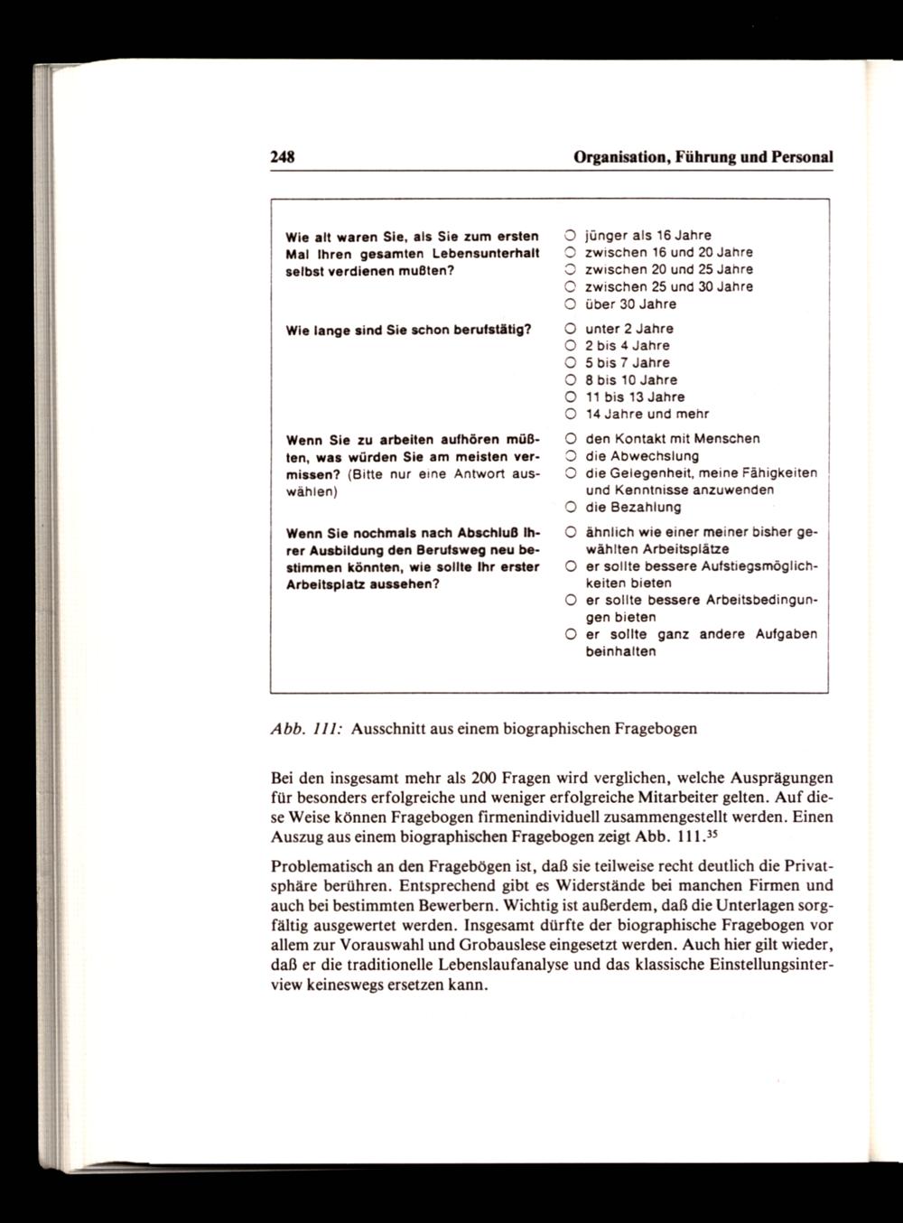 Bei den insgesamt mehr als 200 Fragen wird verglichen, welche Ausprägungen für besonders erfolgreiche und weniger erfolgreiche Mitarbeiter gelten. Auf diese Weise können Fragebogen firmenindividuell zusammengestellt werden. Einen Auszug aus einem biographischen Fragebogen zeigt Abb. 111.35