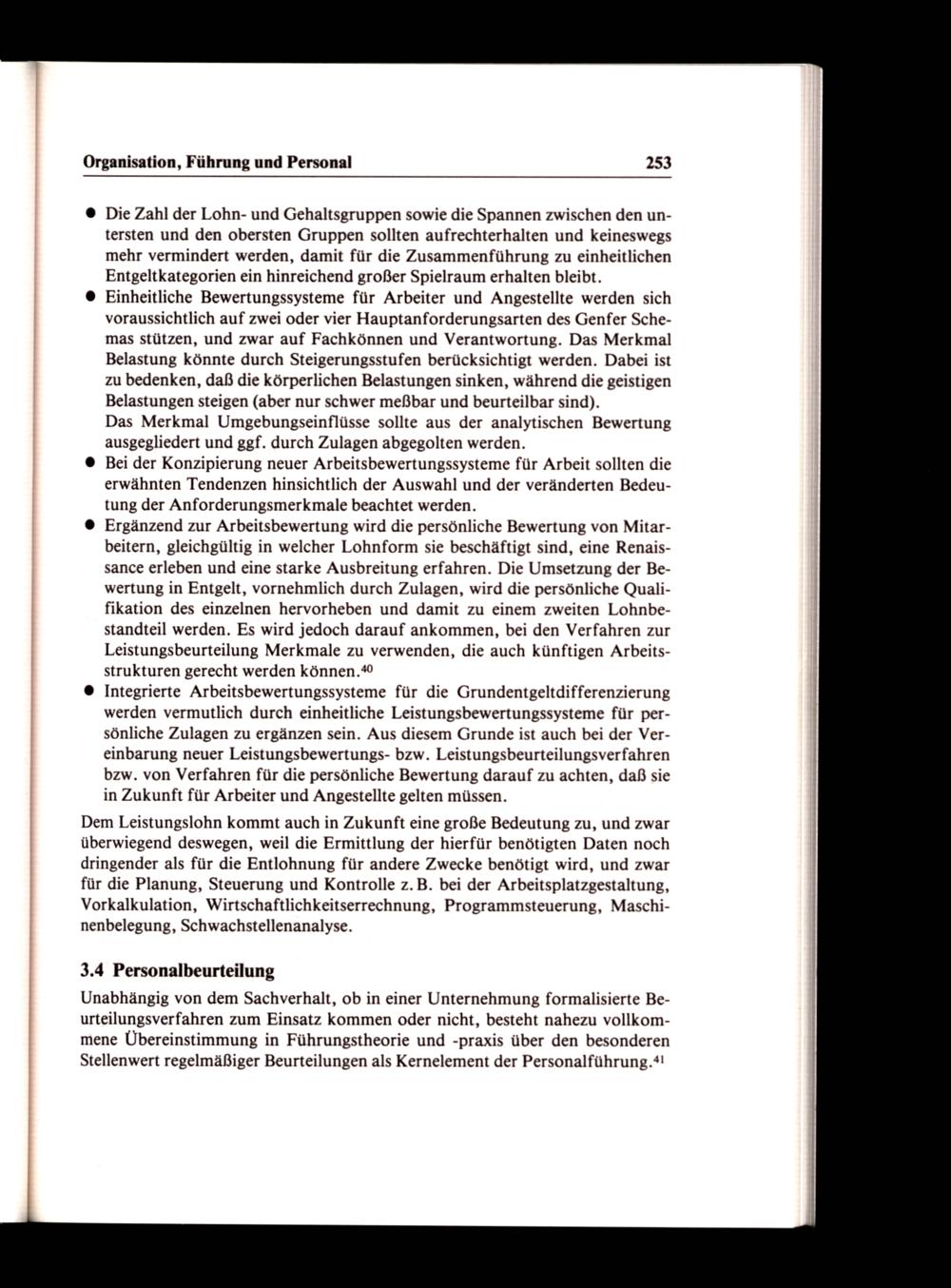 ® Ergänzend zur Arbeitsbewertung wird die persönliche Bewertung von Mitarbeitern, gleichgültig in welcher Lohnform sie beschäftigt sind, eine Renaissance erleben und eine starke Ausbreitung erfahren. Die Umsetzung der Bewertung in Entgelt, vornehmlich durch Zulagen, wird die persönliche Qualifikation des einzelnen hervorheben und damit zu einem zweiten Lohnbestandteil werden. Es wird jedoch darauf ankommen, bei den Verfahren zur Leistungsbeurteilung Merkmale zu verwenden, die auch künftigen Arbeitsstrukturen gerecht werden können.“