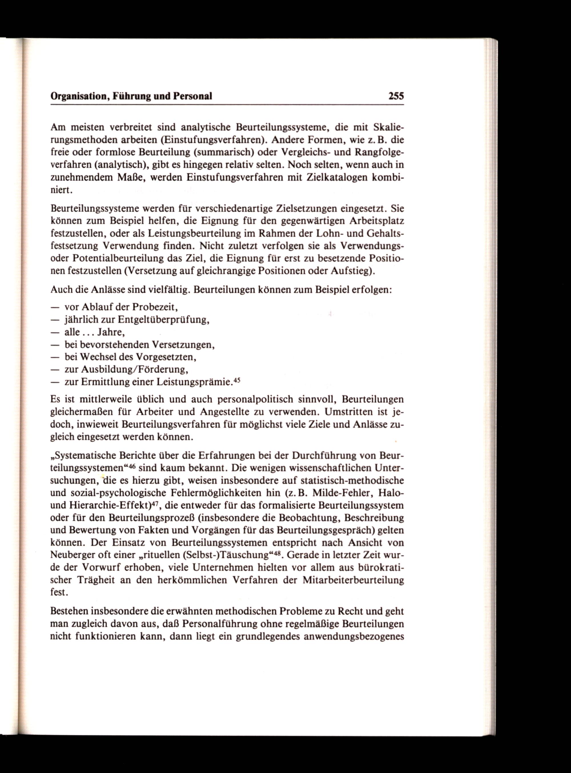„Systematische Berichte über die Erfahrungen bei der Durchführung von Beurteilungssystemen“4 sind kaum bekannt. Die wenigen wissenschaftlichen Untersuchungen, die es hierzu gibt, weisen insbesondere auf statistisch-methodische und sozial-psychologische Fehlermöglichkeiten hin(z.B. Milde-Fehler, Halound Hierarchie-Effekt)*’, die entweder für das formalisierte Beurteilungssystem oder für den Beurteilungsprozeß(insbesondere die Beobachtung, Beschreibung und Bewertung von Fakten und Vorgängen für das Beurteilungsgespräch) gelten können. Der Einsatz von Beurteilungssystemen entspricht nach Ansicht von Neuberger oft einer„rituellen(Selbst-)Täuschung“#. Gerade in letzter Zeit wurde der Vorwurf erhoben, viele Unternehmen hielten vor allem aus bürokratischer Trägheit an den herkömmlichen Verfahren der Mitarbeiterbeurteilung fest.