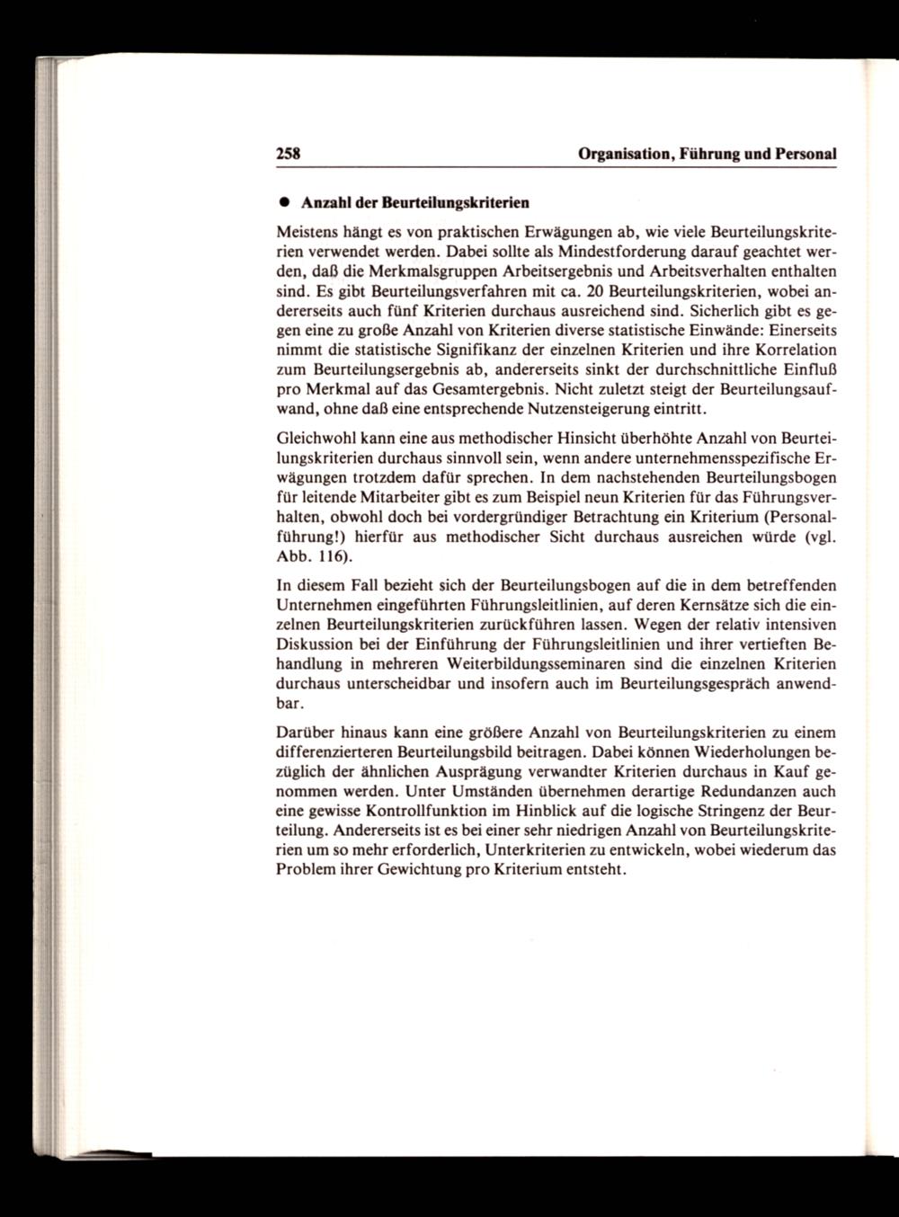 Gleichwohl kann eine aus methodischer Hinsicht überhöhte Anzahl von Beurteilungskriterien durchaus sinnvoll sein, wenn andere unternehmensspezifische Erwägungen trotzdem dafür sprechen. In dem nachstehenden Beurteilungsbogen für leitende Mitarbeiter gibt es zum Beispiel neun Kriterien für das Führungsverhalten, obwohl doch bei vordergründiger Betrachtung ein Kriterium(Personalführung!) hierfür aus methodischer Sicht durchaus ausreichen würde(vgl. Abb. 116).