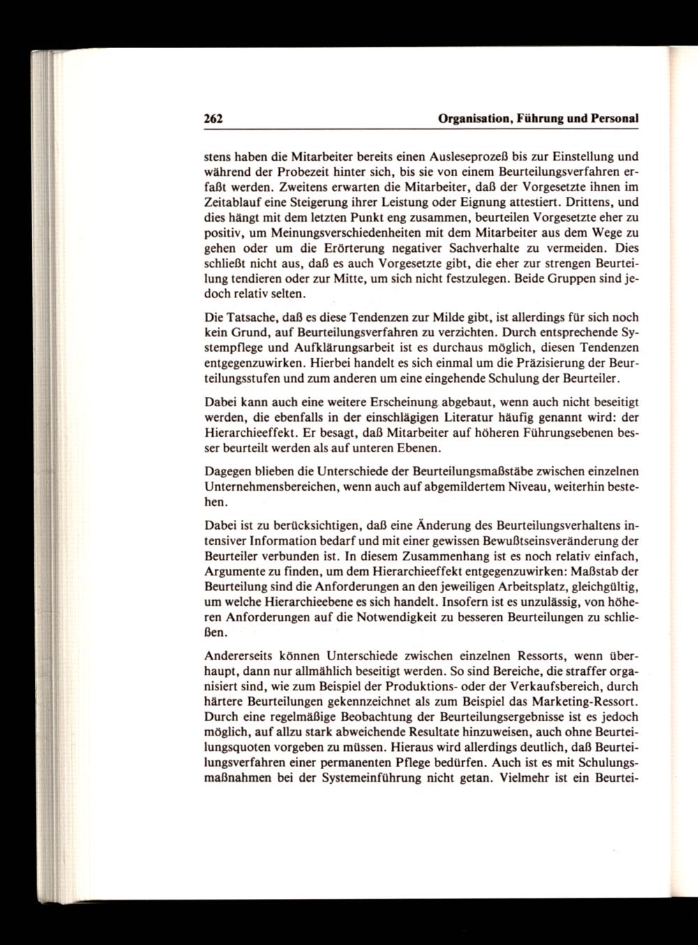 stens haben die Mitarbeiter bereits einen Ausleseprozeß bis zur Einstellung und während der Probezeit hinter sich, bis sie von einem Beurteilungsverfahren erfaßt werden. Zweitens erwarten die Mitarbeiter, daß der Vorgesetzte ihnen im Zeitablauf eine Steigerung ihrer Leistung oder Eignung attestiert. Drittens, und dies hängt mit dem letzten Punkt eng zusammen, beurteilen Vorgesetzte eher zu positiv, um Meinungsverschiedenheiten mit dem Mitarbeiter aus dem Wege zu gehen oder um die Erörterung negativer Sachverhalte zu vermeiden. Dies schließt nicht aus, daß es auch Vorgesetzte gibt, die eher zur strengen Beurteilung tendieren oder zur Mitte, um sich nicht festzulegen. Beide Gruppen sind jedoch relativ selten.