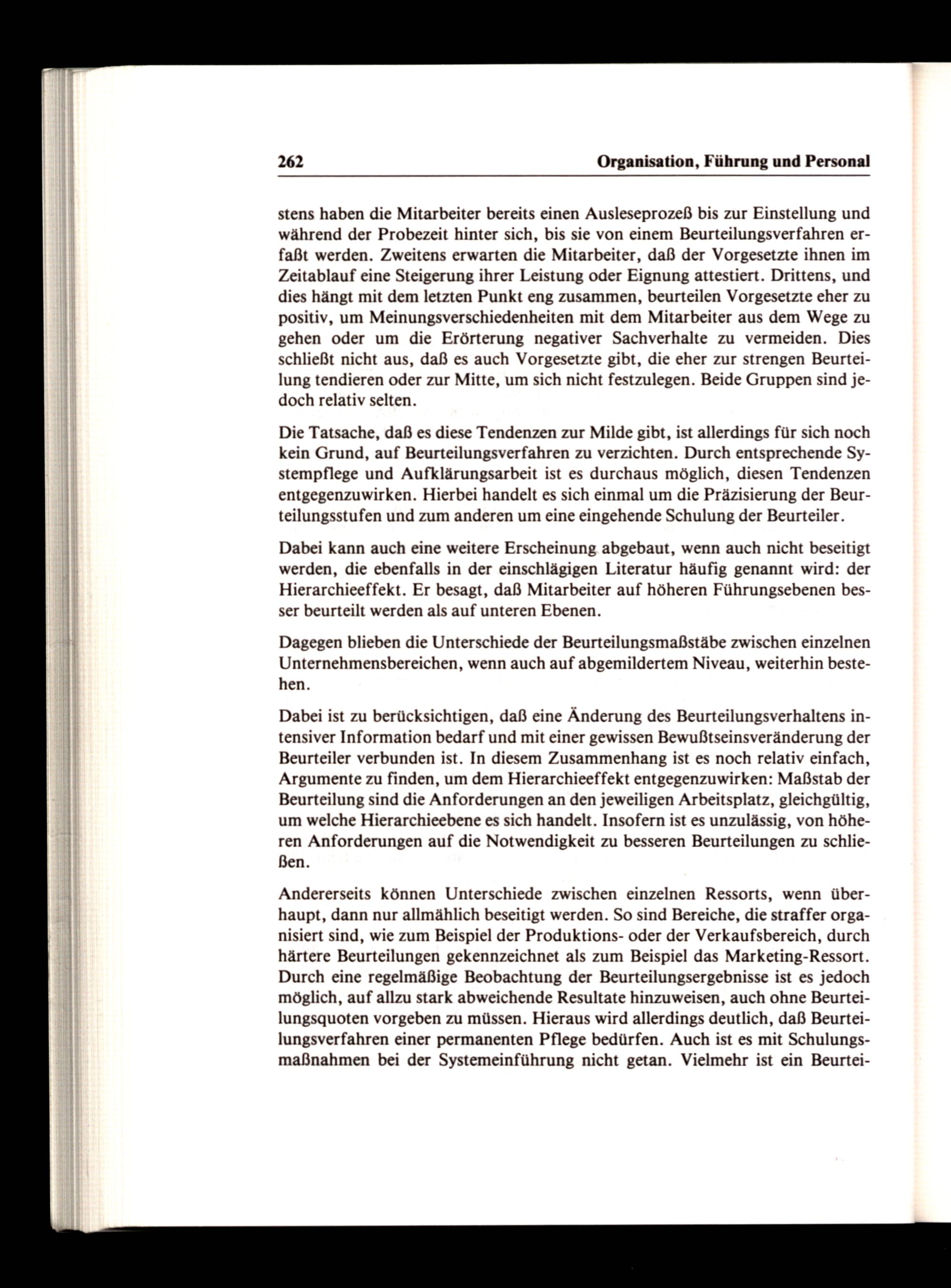 Andererseits können Unterschiede zwischen einzelnen Ressorts, wenn überhaupt, dann nur allmählich beseitigt werden. So sind Bereiche, die straffer organisiert sind, wie zum Beispiel der Produktions- oder der Verkaufsbereich, durch härtere Beurteilungen gekennzeichnet als zum Beispiel das Marketing-Ressort. Durch eine regelmäßige Beobachtung der Beurteilungsergebnisse ist es jedoch möglich, auf allzu stark abweichende Resultate hinzuweisen, auch ohne Beurteilungsquoten vorgeben zu müssen. Hieraus wird allerdings deutlich, daß Beurteilungsverfahren einer permanenten Pflege bedürfen. Auch ist es mit Schulungsmaßnahmen bei der Systemeinführung nicht getan. Vielmehr ist ein Beurtei