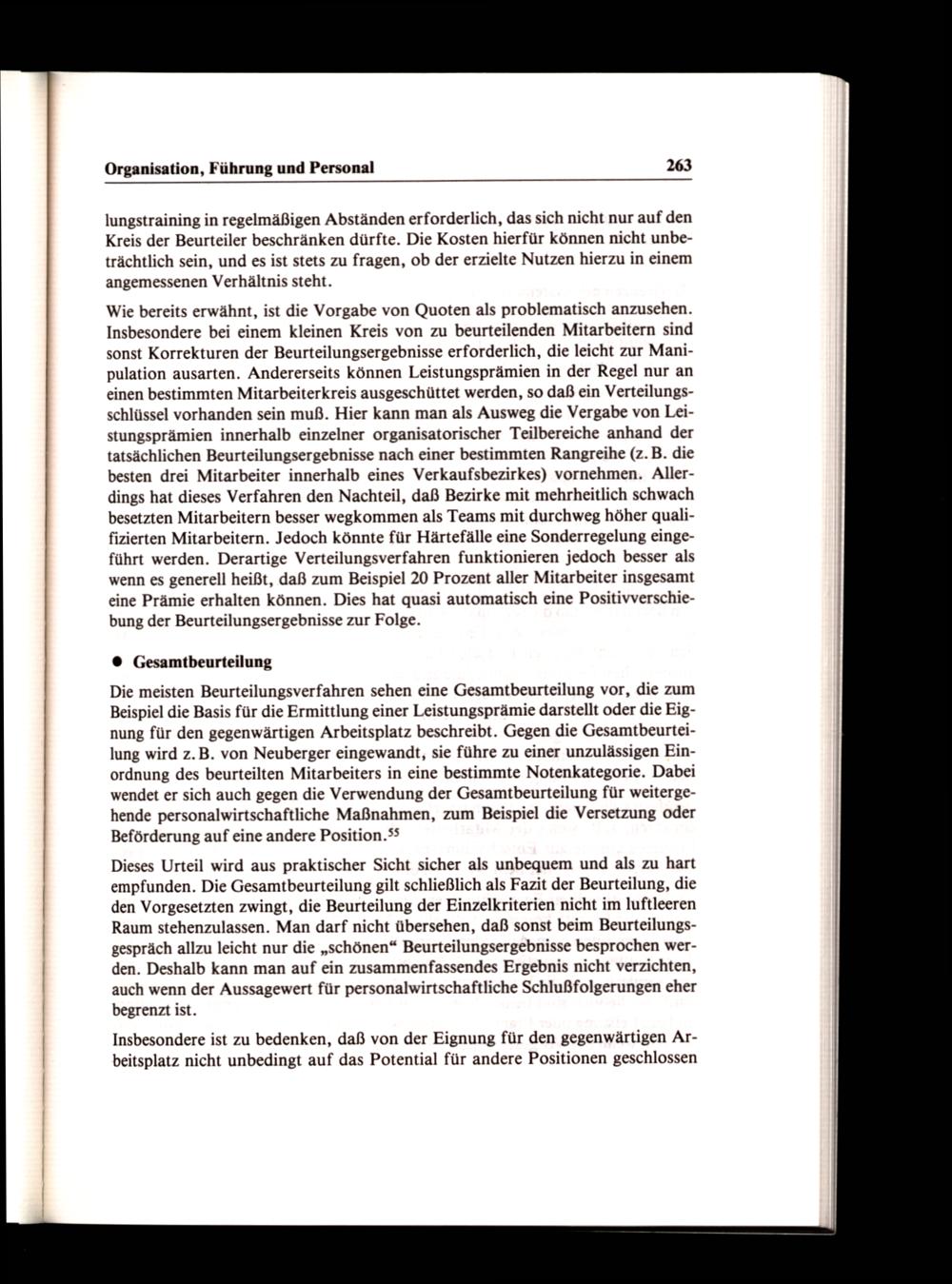 Dieses Urteil wird aus praktischer Sicht sicher als unbequem und als zu hart empfunden. Die Gesamtbeurteilung gilt schließlich als Fazit der Beurteilung, die den Vorgesetzten zwingt, die Beurteilung der Einzelkriterien nicht im luftleeren Raum stehenzulassen. Man darf nicht übersehen, daß sonst beim Beurteilungsgespräch allzu leicht nur die„schönen“ Beurteilungsergebnisse besprochen werden. Deshalb kann man auf ein zusammenfassendes Ergebnis nicht verzichten, auch wenn der Aussagewert für personalwirtschaftliche Schlußfolgerungen eher begrenzt ist.