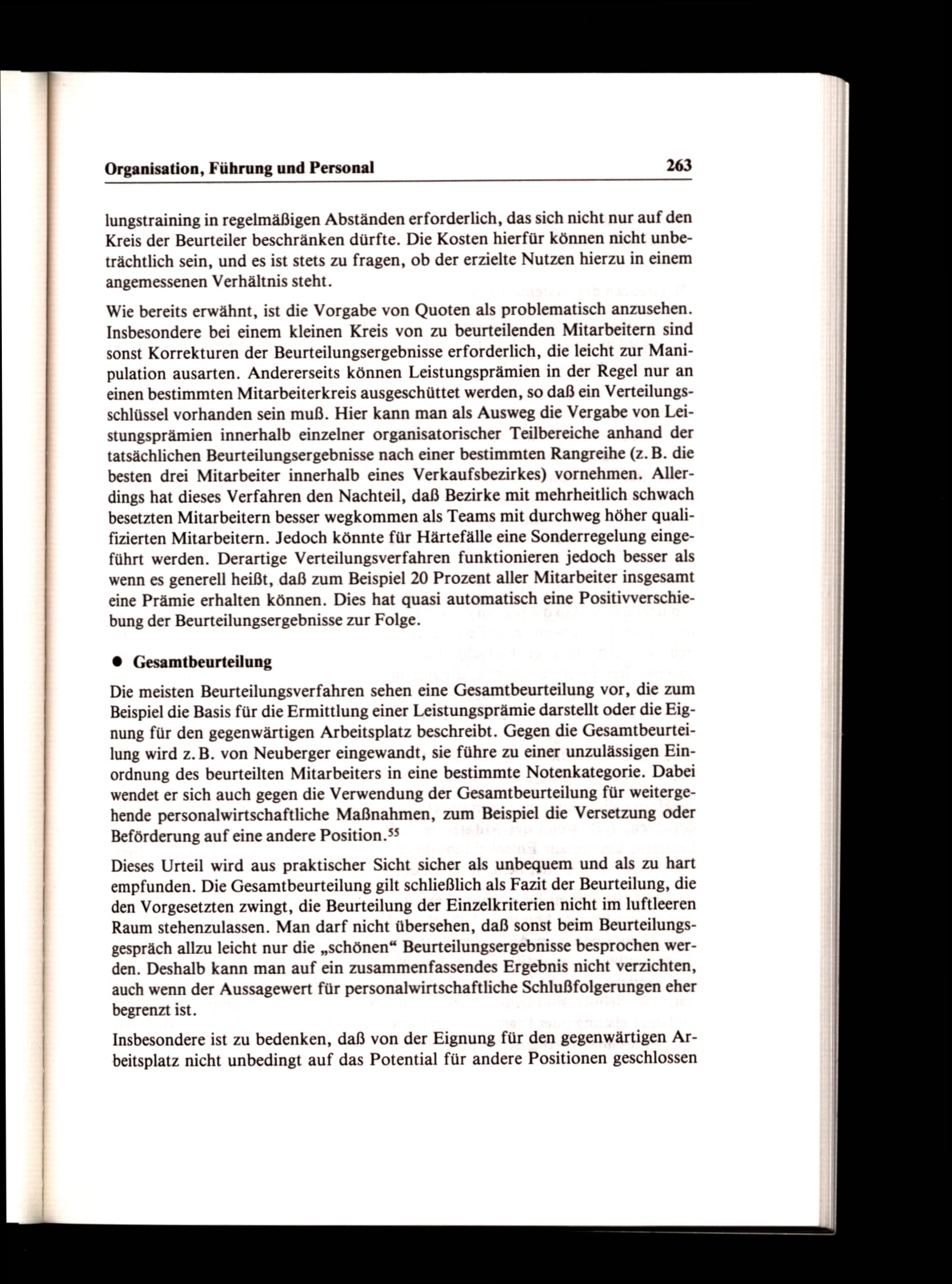 Die meisten Beurteilungsverfahren sehen eine Gesamtbeurteilung vor, die zum Beispiel die Basis für die Ermittlung einer Leistungsprämie darstellt oder die Eignung für den gegenwärtigen Arbeitsplatz beschreibt. Gegen die Gesamtbeurteilung wird z.B. von Neuberger eingewandt, sie führe zu einer unzulässigen Einordnung des beurteilten Mitarbeiters in eine bestimmte Notenkategorie. Dabei wendet er sich auch gegen die Verwendung der Gesamtbeurteilung für weitergehende personalwirtschaftliche Maßnahmen, zum Beispiel die Versetzung oder Beförderung auf eine andere Position.°5