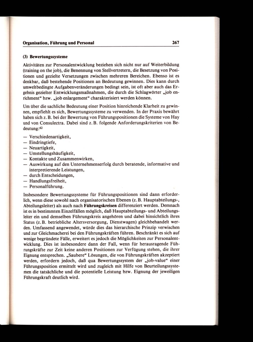 Insbesondere Bewertungssysteme für Führungspositionen sind dann erforderlich, wenn diese sowohl nach organisatorischen Ebenen(z. B. Hauptabteilungs-, Abteilungsleiter) als auch nach Führungskreisen differenziert werden. Demnach ist es in bestimmten Einzelfällen möglich, daß Hauptabteilungs- und Abteilungsleiter ein und demselben Führungskreis angehören und dabei hinsichtlich ihres Status(z.B. betriebliche Altersversorgung, Dienstwagen) gleichbehandelt werden. Umfassend angewendet, würde dies das hierarchische Prinzip verwischen und zur Gleichmacherei bei den Führungskräften führen. Beschränkt es sich auf wenige begründete Fälle, erweitert es jedoch die Möglichkeiten zur Personalentwicklung. Dies ist insbesondere dann der Fall, wenn für herausragende Führungskräfte zur Zeit keine anderen Positionen zur Verfügung stehen, die ihrer Eignung entsprechen.„Saubere“ Lösungen, die von Führungskräften akzeptiert werden, erfordern jedoch, daß qua Bewertungssystem der„job-value“ einer Führungsposition ermittelt wird und zugleich mit Hilfe von Beurteilungssystemen die tatsächliche und die potentielle Leistung bzw. Eignung der jeweiligen Führungskraft deutlich wird.