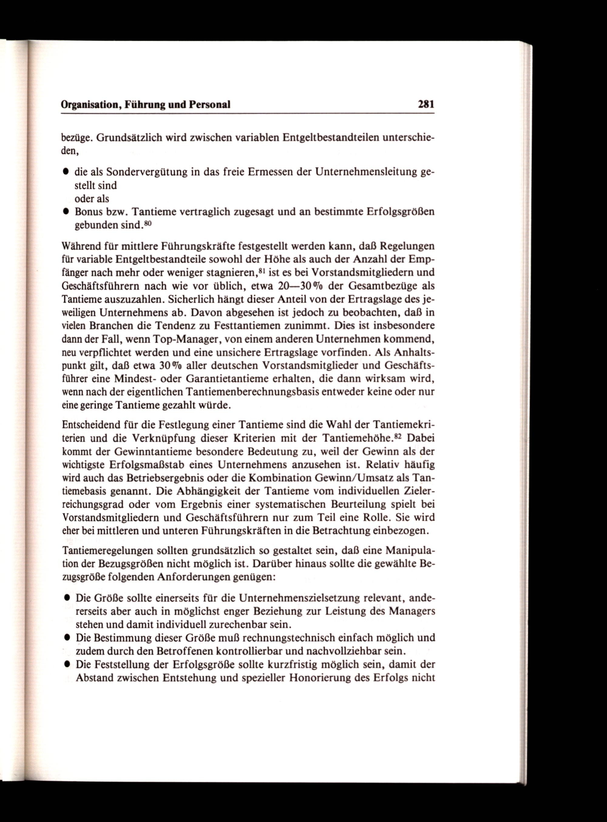 Während für mittlere Führungskräfte festgestellt werden kann, daß Regelungen für variable Entgeltbestandteile sowohl der Höhe als auch der Anzahl der Empfänger nach mehr oder weniger stagnieren,8! ist es bei Vorstandsmitgliedern und Geschäftsführern nach wie vor üblich, etwa 20—30% der Gesamtbezüge als Tantieme auszuzahlen. Sicherlich hängt dieser Anteil von der Ertragslage des jeweiligen Unternehmens ab. Davon abgesehen ist jedoch zu beobachten, daß in vielen Branchen die Tendenz zu Festtantiemen zunimmt. Dies ist insbesondere dann der Fall, wenn Top-Manager, von einem anderen Unternehmen kommend, neu verpflichtet werden und eine unsichere Ertragslage vorfinden. Als Anhaltspunkt gilt, daß etwa 30% aller deutschen Vorstandsmitglieder und Geschäftsführer eine Mindest- oder Garantietantieme erhalten, die dann wirksam wird, wenn nach der eigentlichen Tantiemenberechnungsbasis entweder keine oder nur eine geringe Tantieme gezahlt würde.
