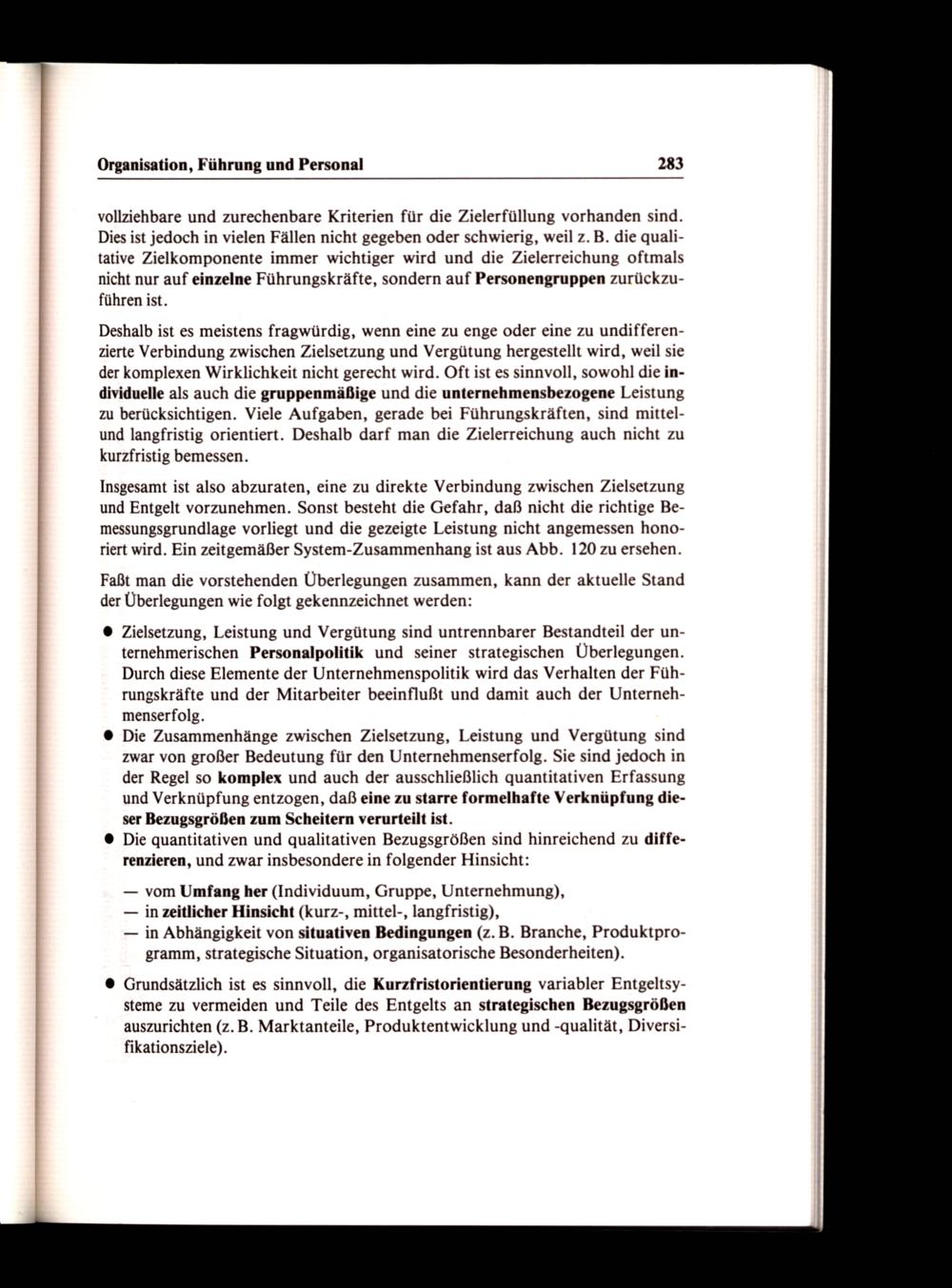 Insgesamt ist also abzuraten, eine zu direkte Verbindung zwischen Zielsetzung und Entgelt vorzunehmen. Sonst besteht die Gefahr, daß nicht die richtige Bemessungsgrundlage vorliegt und die gezeigte Leistung nicht angemessen honoriert wird. Ein zeitgemäßer System-Zusammenhang ist aus Abb. 120 zu ersehen.
