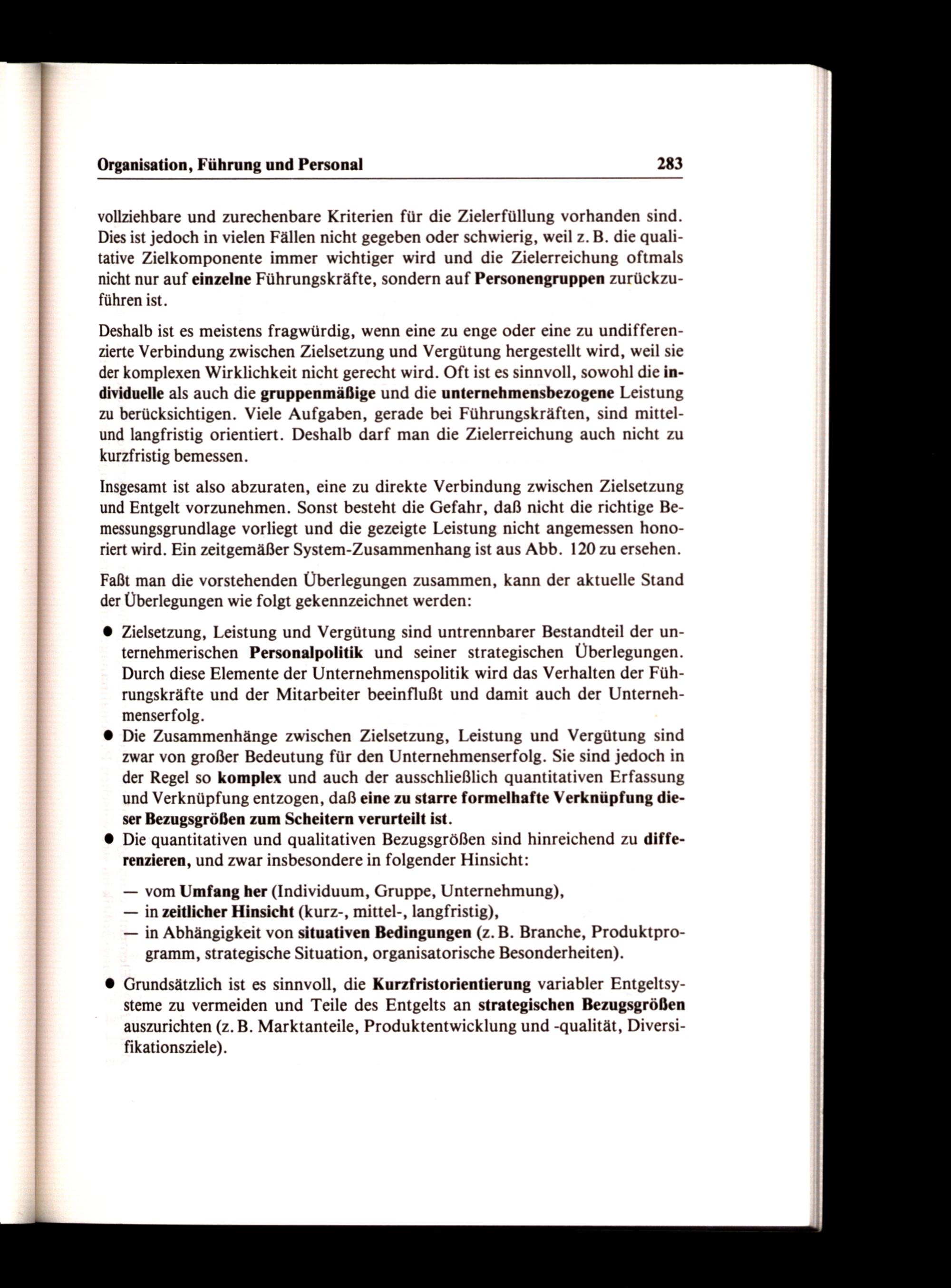 Deshalb ist es meistens fragwürdig, wenn eine zu enge oder eine zu undifferenzierte Verbindung zwischen Zielsetzung und Vergütung hergestellt wird, weil sie der komplexen Wirklichkeit nicht gerecht wird. Oft ist es sinnvoll, sowohl die individuelle als auch die gruppenmäßige und die unternehmensbezogene Leistung zu berücksichtigen. Viele Aufgaben, gerade bei Führungskräften, sind mittelund langfristig orientiert. Deshalb darf man die Zielerreichung auch nicht zu kurzfristig bemessen.