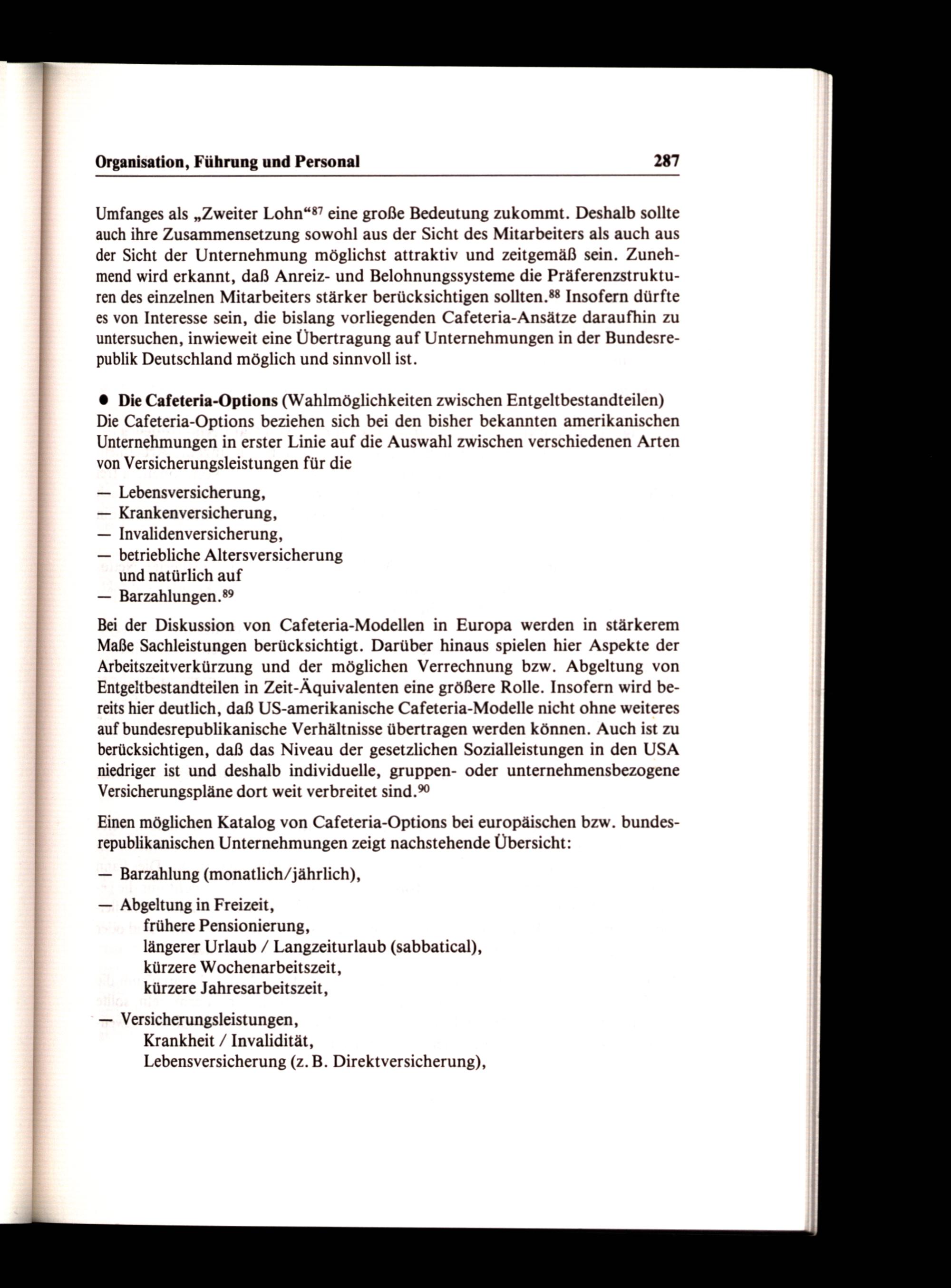 Bei der Diskussion von Cafeteria-Modellen in Europa werden in stärkerem Maße Sachleistungen berücksichtigt. Darüber hinaus spielen hier Aspekte der Arbeitszeitverkürzung und der möglichen Verrechnung bzw. Abgeltung von Entgeltbestandteilen in Zeit-Äquivalenten eine größere Rolle. Insofern wird bereits hier deutlich, daß US-amerikanische Cafeteria-Modelle nicht ohne weiteres auf bundesrepublikanische Verhältnisse übertragen werden können. Auch ist zu berücksichtigen, daß das Niveau der gesetzlichen Sozialleistungen in den USA niedriger ist und deshalb individuelle, gruppen- oder unternehmensbezogene Versicherungspläne dort weit verbreitet sind.”