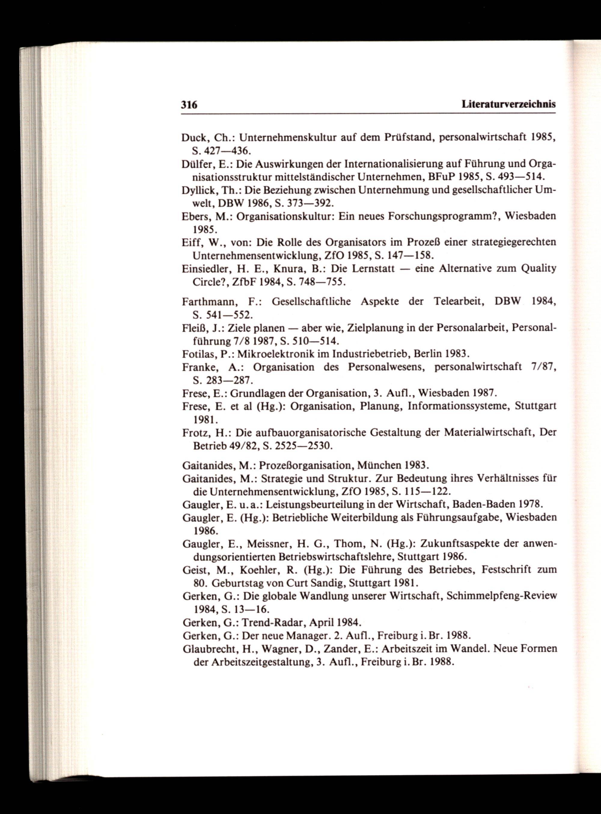 Duck, Ch.: Unternehmenskultur auf dem Prüfstand, personalwirtschaft 1985, S. 427—436. Dülfer, E.: Die Auswirkungen der Internationalisierung auf Führung und Organisationsstruktur mittelständischer Unternehmen, BFuP 1985, S. 493—514. Dyllick, Th.: Die Beziehung zwischen Unternehmung und gesellschaftlicher Umwelt, DBW 1986, S. 373—392.
