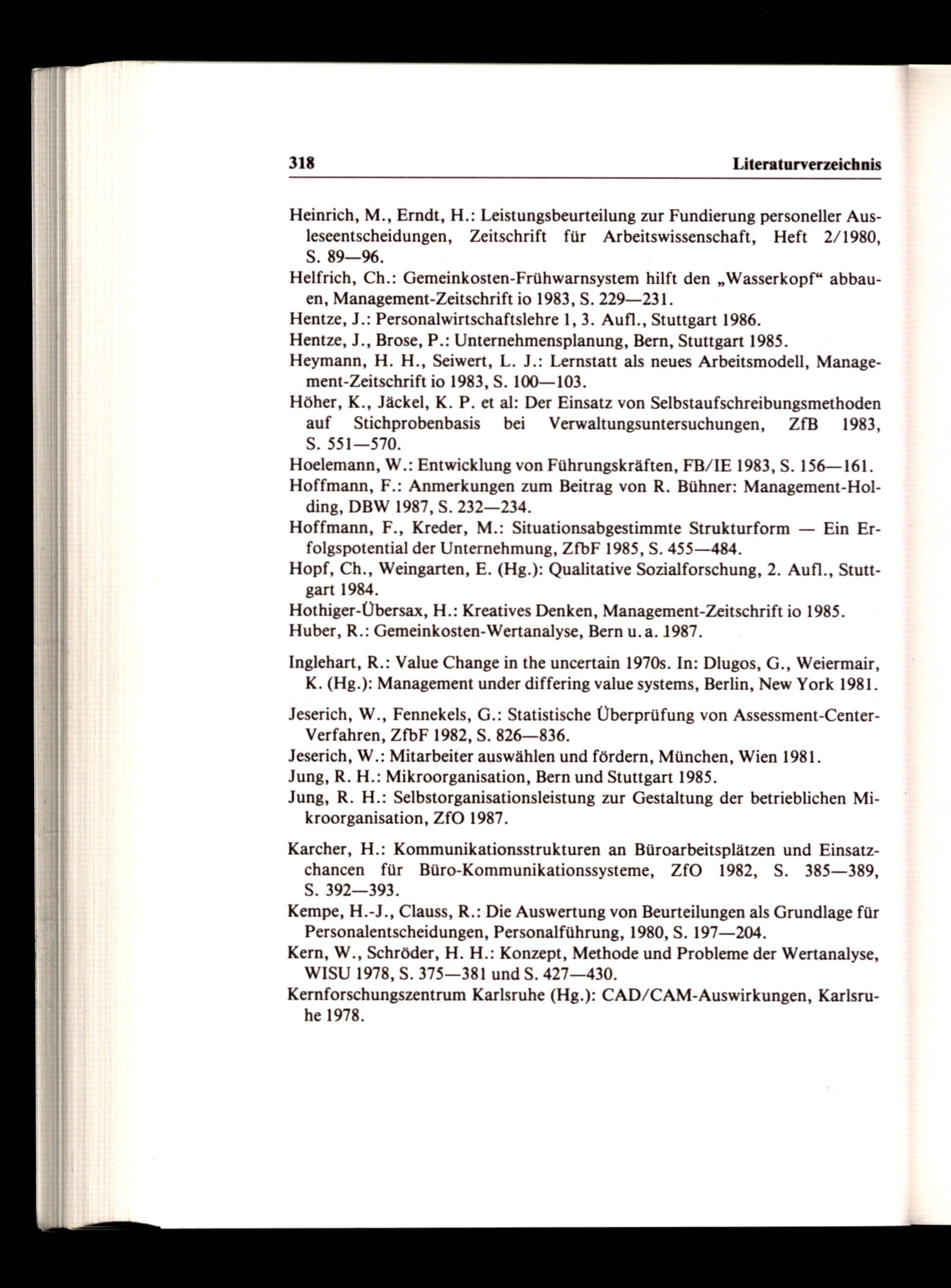 Heinrich, M., Erndt, H.: Leistungsbeurteilung zur Fundierung personeller Aus{ leseentscheidungen, Zeitschrift für Arbeitswissenschaft, Heft 2/1980, I S. 89—96. MM Helfrich, Ch.: Gemeinkosten-Frühwarnsystem hilft den„Wasserkopf“ abbau1 en, Management-Zeitschrift io 1983, S. 229—231. | I Hentze, J.: Personalwirtschaftslehre 1, 3. Aufl., Stuttgart 1986. N Hentze, J., Brose, P.: Unternehmensplanung, Bern, Stuttgart 1985. | Heymann, H. H., Seiwert, L. J.: Lernstatt als neues Arbeitsmodell, Manage| ment-Zeitschrift io 1983, S. 100—103. | Höher, K., Jäckel, K. P. et al: Der Einsatz von Selbstaufschreibungsmethoden | auf Stichprobenbasis bei_—Verwaltungsuntersuchungen, ZfB 1983, | S. 551—570. | Hoelemann, W.: Entwicklung von Führungskräften, FB/IE 1983, S. 156—161. | Hoffmann, F.: Anmerkungen zum Beitrag von R. Bühner: Management-Holding, DBW 1987, S. 232—234. Hoffmann, F., Kreder, M.: Situationsabgestimmte Strukturform— Ein Erfolgspotential der Unternehmung, ZfbF 1985, S. 455—484. Hopf, Ch., Weingarten, E.(Hg.): Qualitative Sozialforschung, 2. Aufl., Stuttgart 1984. Hothiger-Übersax, H.: Kreatives Denken, Management-Zeitschrift io 1985. Huber, R.: Gemeinkosten-Wertanalyse, Bern u.a. 1987.