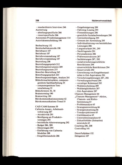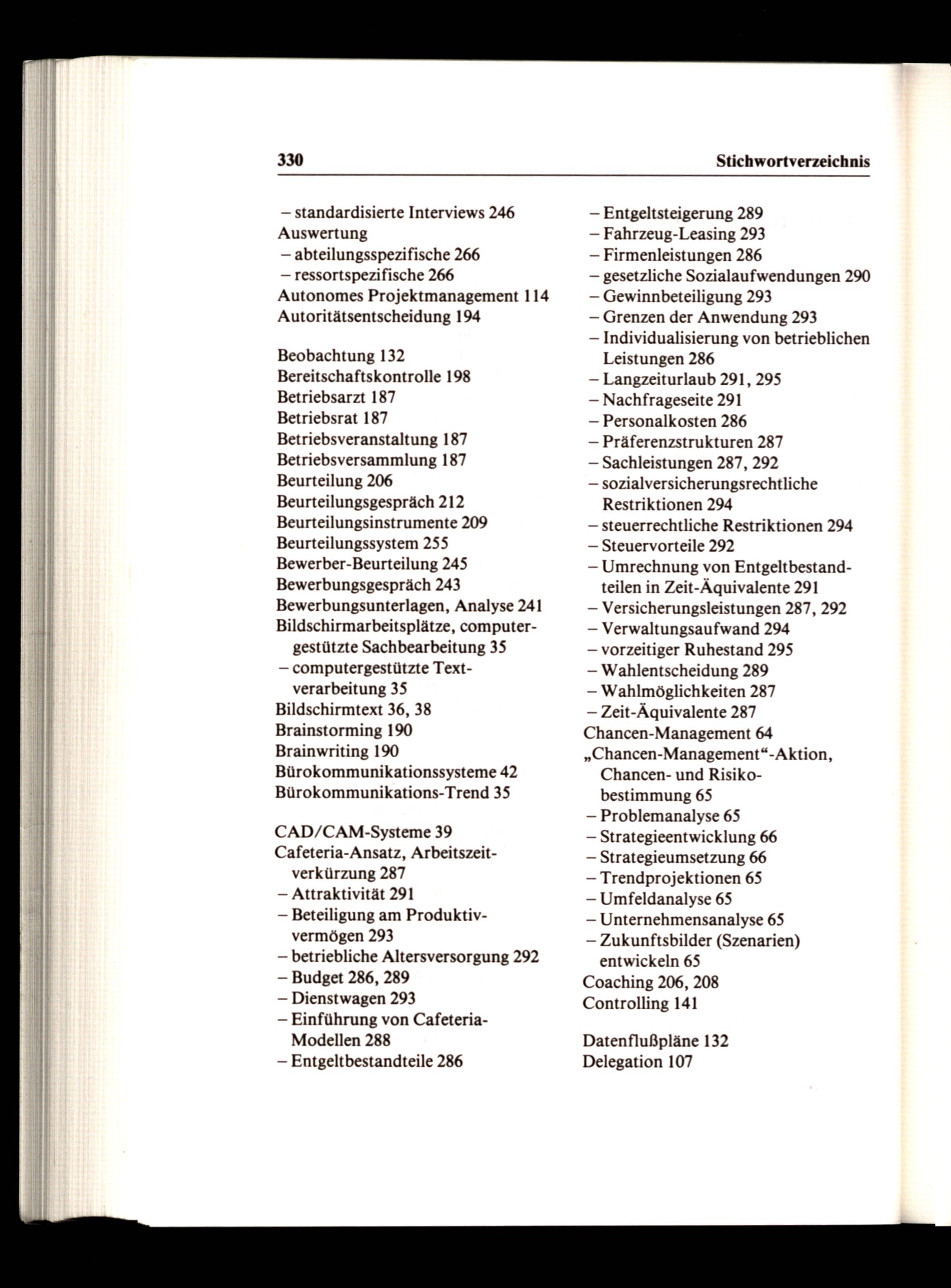 — Entgeltsteigerung 289 — Fahrzeug-Leasing 293 — Firmenleistungen 286 — gesetzliche Sozialaufwendungen 290 — Gewinnbeteiligung 293 — Grenzen der Anwendung 293 — Individualisierung von betrieblichen Leistungen 286 — Langzeiturlaub 291, 295 — Nachfrageseite 291 — Personalkosten 286 — Präferenzstrukturen 287 — Sachleistungen 287, 292 — sozialversicherungsrechtliche Restriktionen 294 — steuerrechtliche Restriktionen 294 — Steuervorteile 292 — Umrechnung von Entgeltbestandteilen in Zeit-Äquivalente 291 — Versicherungsleistungen 287, 292 — Verwaltungsaufwand 294 — vorzeitiger Ruhestand 295 — Wahlentscheidung 289 — Wahlmöglichkeiten 287 — Zeit-Äquivalente 287 Chancen-Management 64 „Chancen-Management“-Aktion, Chancen- und Risikobestimmung 65 — Problemanalyse 65 — Strategieentwicklung 66 — Strategieumsetzung 66 — Trendprojektionen 65 — Umfeldanalyse 65 — Unternehmensanalyse 65 — Zukunftsbilder(Szenarien) entwickeln 65 Coaching 206, 208 Controlling 141